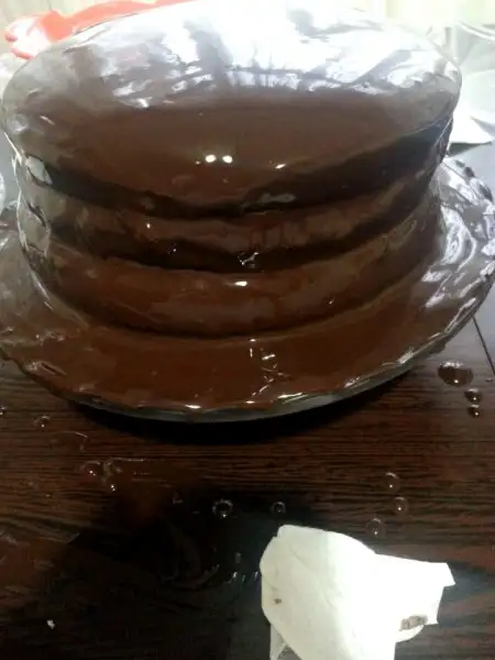 çikolata sosu soğudugunda pastanın üzerine tencereyi ters çevirerek boşalttım