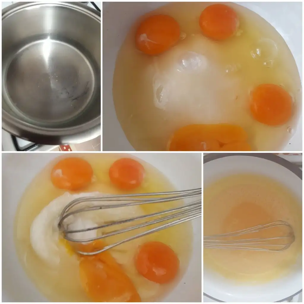 4 yumurta ve şekeri ısıya dayanıklı bir kaba alıyoruz. Bir tencerede su kaynatıp bu kabı tencerenin üzerine alıyoruz. Şekeri ve yumurtayı benmari usulü eritip pişireceğiz. Özellikle dikkat etmek gereken bir nokta var. Kabın suya değmemesi gerekiyor. Karışımın üzeri köpük köpük olana kadar karıştırıyoruz. Eki Görüntüle 2832116