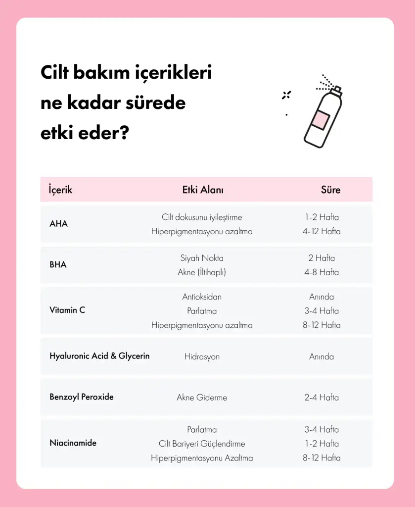 Glikolik asit + Nacinamide birlikte iyi çalışır. Haftada üç akşam kullanabilirsin. Bunları kullanırken başka bir şey kullanmaya gerek yok.