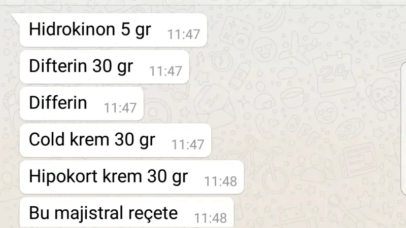 İlk önce bu reçetenin içeriğini eczaneye gidip temiz bir kagida geçirin ve hepsinden kaçar gram olduğunu..daha sonra sağlıkocağına gidip doktorunuza yazdirin ve eczanede kariştırıp öyle verecekler size..her gece yatmadan önce yüzünüze sürüp yatın yüzü epey soyacak ama sakin korkmayin ve pes etmeyin 1.5ay düzenli kullanın ama güneşe çıkacaksanız güneş kremi sürmeden asla çıkmayınız.
