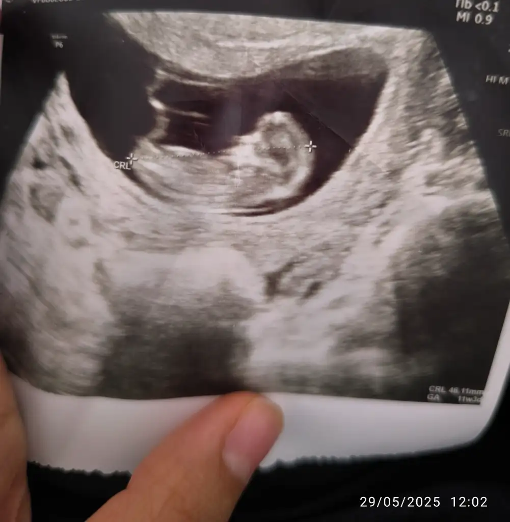 Ultrason görüntüsüne dayanarak gebeliğin yaklaşık 11. haftasında olduğunu görüyorum (aşağıda CRL ve GA bilgisi var). Bu haftalarda bebek henüz cinsiyetini ultrasonla güvenilir şekilde belli edecek kadar gelişmemiştir. Cinsiyet tahmini genellikle 13. haftadan itibaren daha net yapılabilir, ancak en doğru sonuçlar 16. haftadan sonra elde edilir.