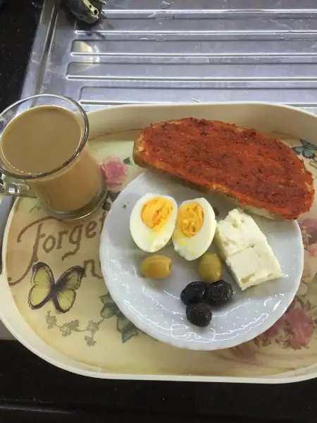 Sabahları standart rejim kahvaltısı haşlanmış yumurta zeytin peynir salatalık ve form çayı