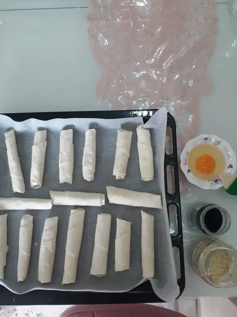 Böreğin üzerine sürebilmek için 1 yumurta. Süsüne susam ve çörek otu.