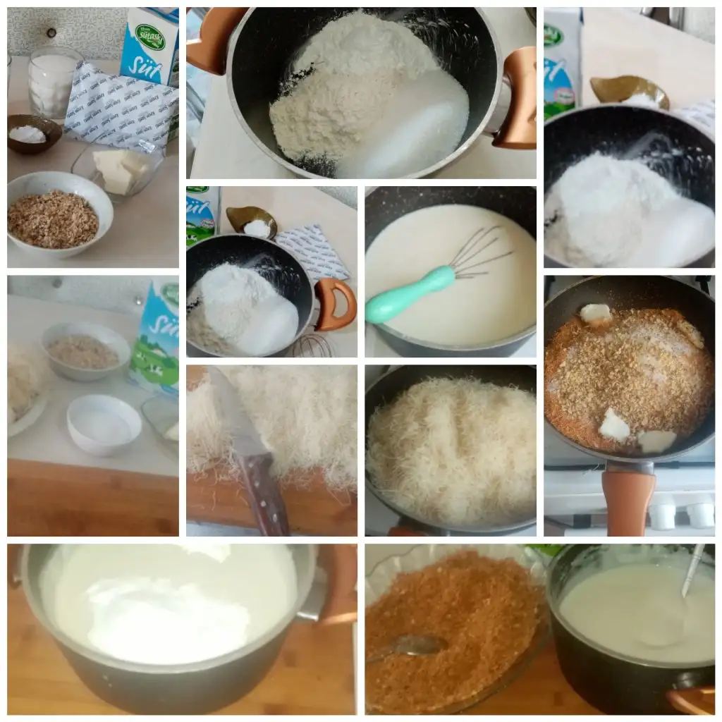Diğer yandan kadayıfı ince ince kesiyoruz ve tavada renk alıncaya kadar kavuruyoruz. Kavrulan kadayıf içine şeker ceviz ve tereyağını ekleyip kenara alıyoruz.