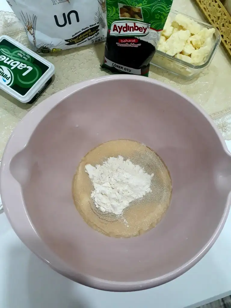 ✴Arkadaşlar bu görselde ılık sütü biraz yogurma kabıma ilave edip 2 yemek kaşığı un 1 paket toz maya ve 3 tatlı kaşığı şekeri de ekleyip 10 dakika ön mayalanma işlemi yapıyorum 10 dakika sonra göz göz olunca kalan malzemeleri hamuru ekleyip yoğuruyorum