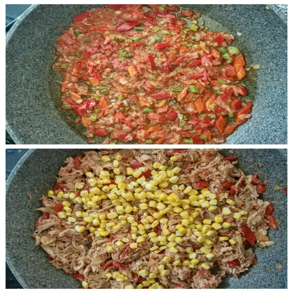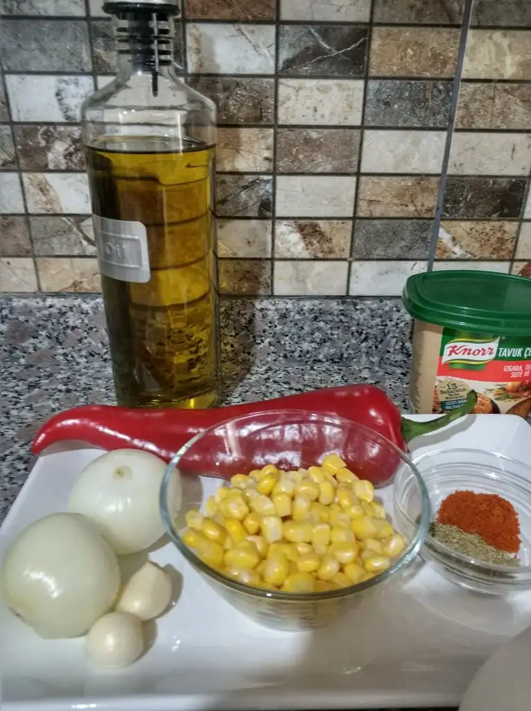 Sotelenen malzemelerin üzerine sırayla domates baharatlar ve mısır eklenip pişirilir.