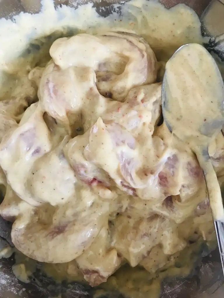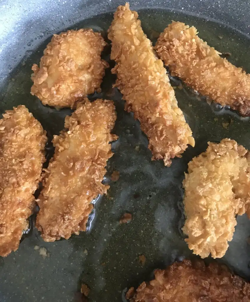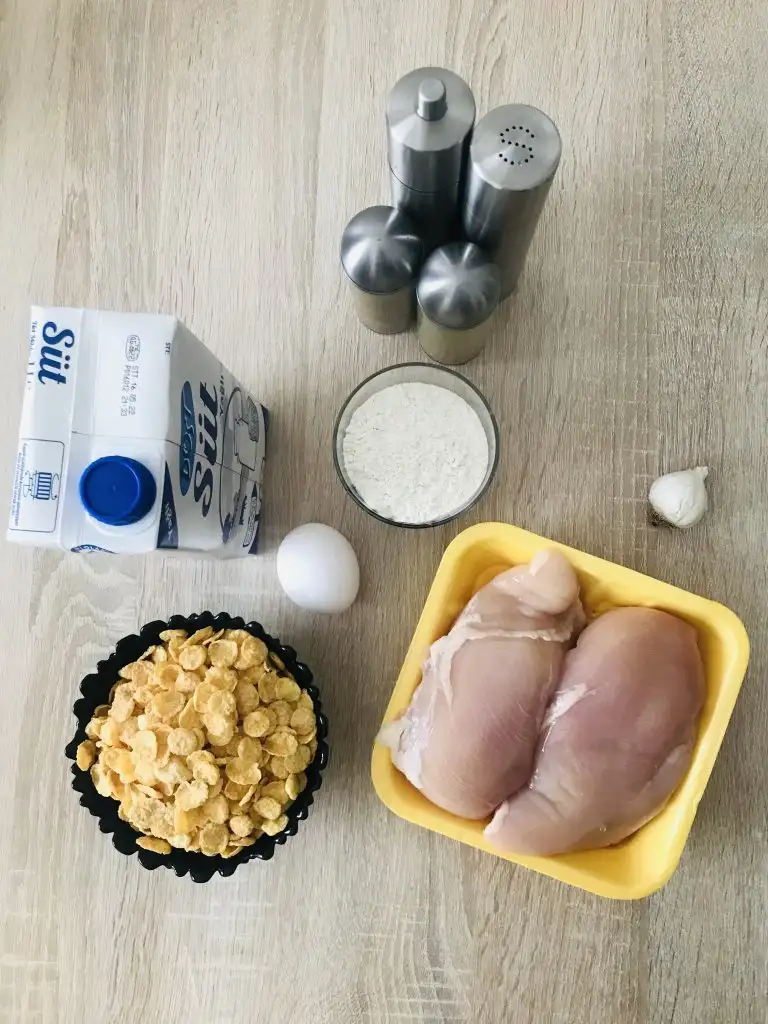 Önce tavuğu orta kalınlıkta parmak şeklinde kesiyoruz. Marine etmek için yumurta, süt, köri, kırmızı biber, sarımsak, tuz, kimyon ve sütü çırpıyoruz. Sonra unu ekleyip koyu kıvamlı bir harç elde ediyoruz. Tavukları sosun içinde karıştırıyoruz. Buzdolabında en az iki saat dinlendiriyoruz. Mısır gevreklerini döverek iyice eziyoruz. Geniş bir tabağa alıyoruz. Tavukları buna bulayıp kızartıyoruz.