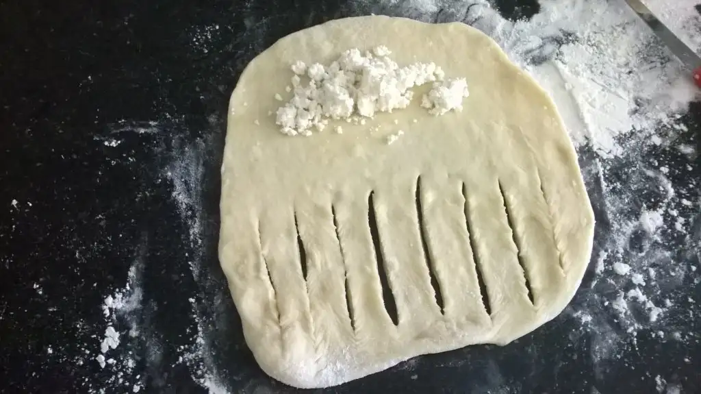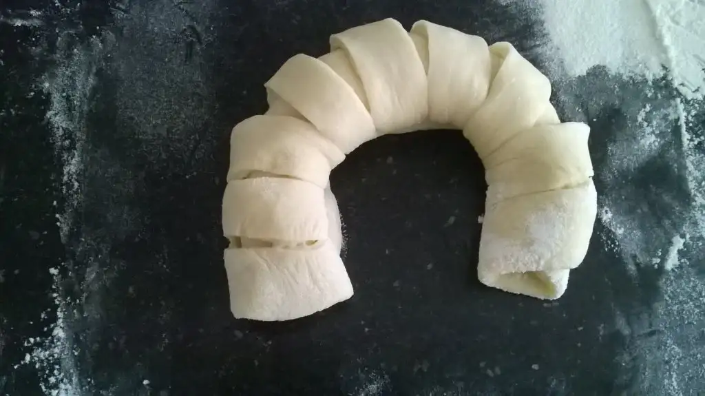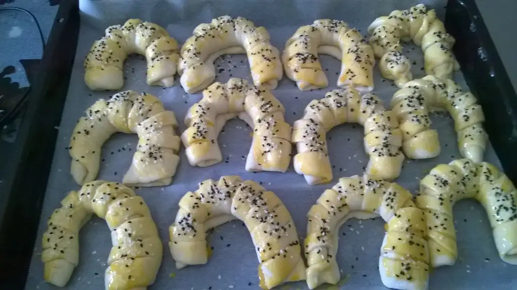 her bir bezemizi yaklaşık pasta tabağı büyüklüğünde, merdanemizle açıyorum, üst kısmına lor peynirini koyup, alt tarafı 1-1,5 cm civarında bıçak ile kesiyorum ve üst taraftan sararak ay şeklini veriyorum.