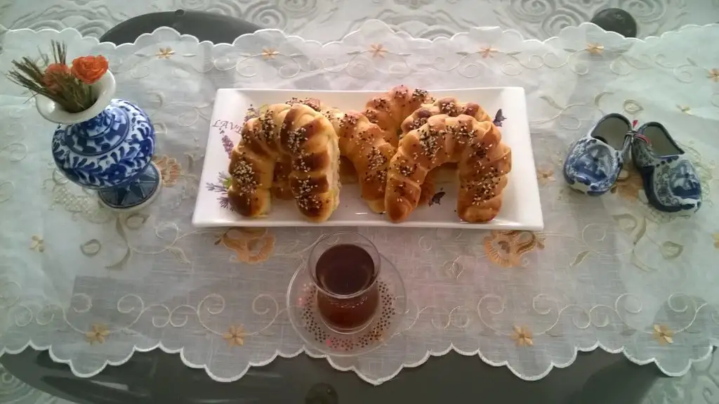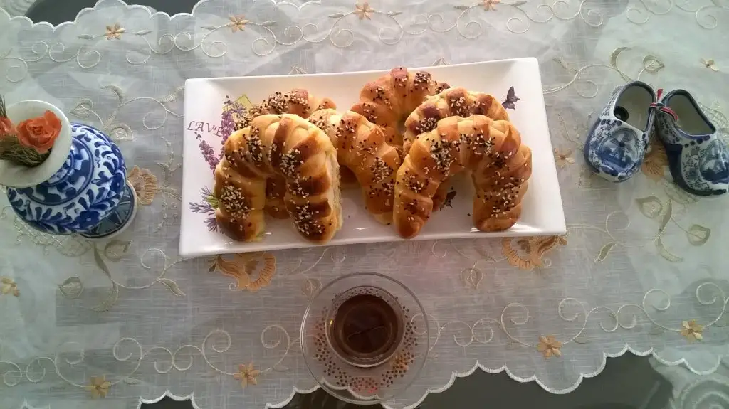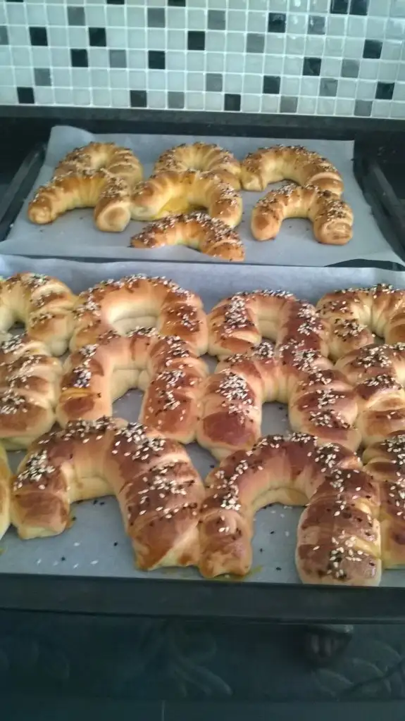 üzerine çok az zeytin yağı ve 1 yumurta sarısını karıştırıp sürüyorum, ayrıca çörek otu ve susam ile süsleyip, 10 dakika daha dinlendirip, fırına koyuyorum. yaklaşık 180 derece sıcaklıkta üzeri kızarana kadar pişiriyorum.