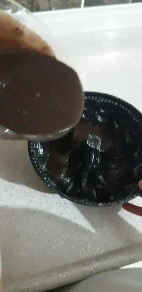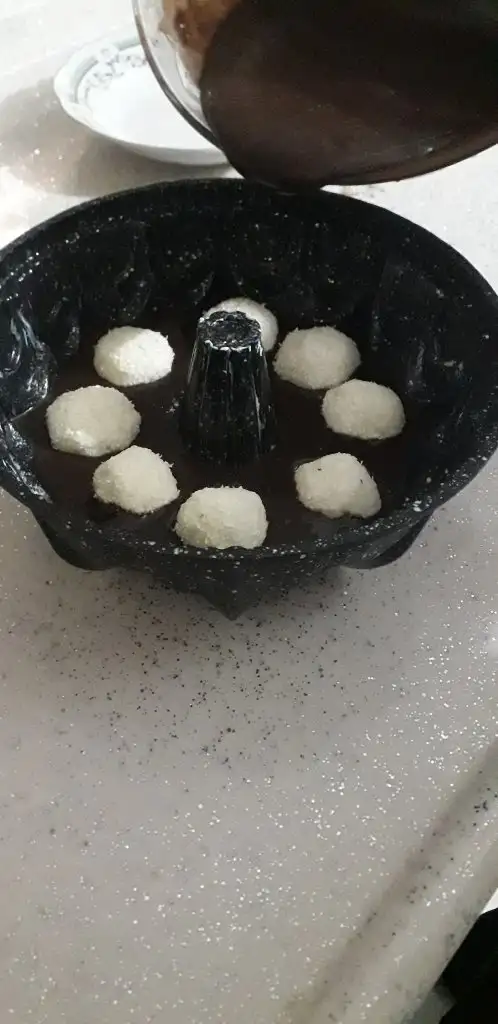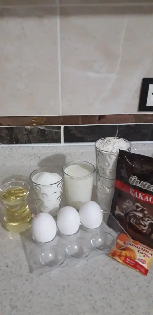 Yumurta ve şekeri çırpıyoruz süt ve sıvı yağı ekleyip kuru malzemeleri ekleyip çırpmaya devam ediyoruz yağladığımız kalıba yarısını döküp