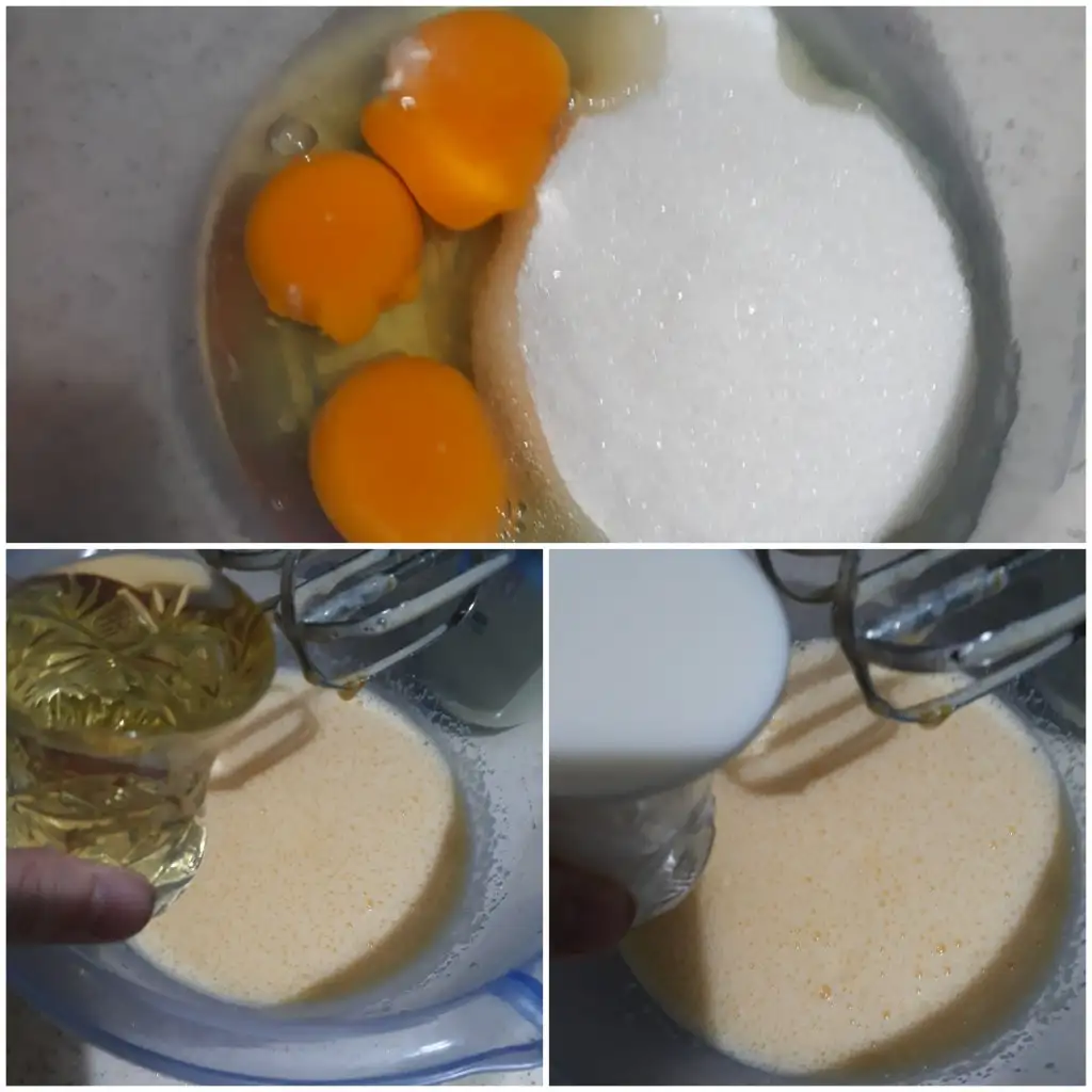 şeker ve yumurtayı köpürene kadar çırpıyoruz. Yağ ve sütü ekleyip çırpmaya devam ediyoruz.