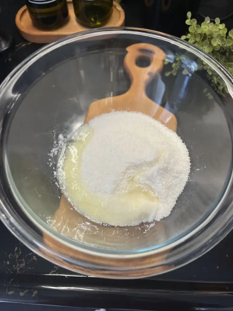 - Hamuru için ilk sıvı malzemeleri, şekeri ilave edip karıştıralım.