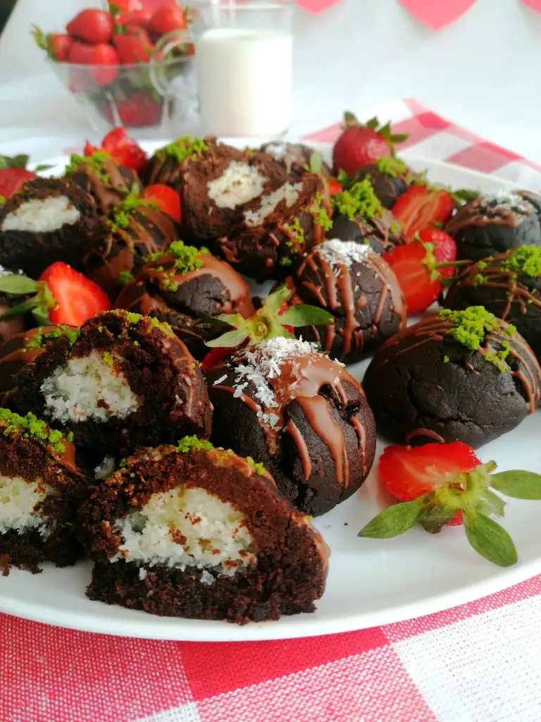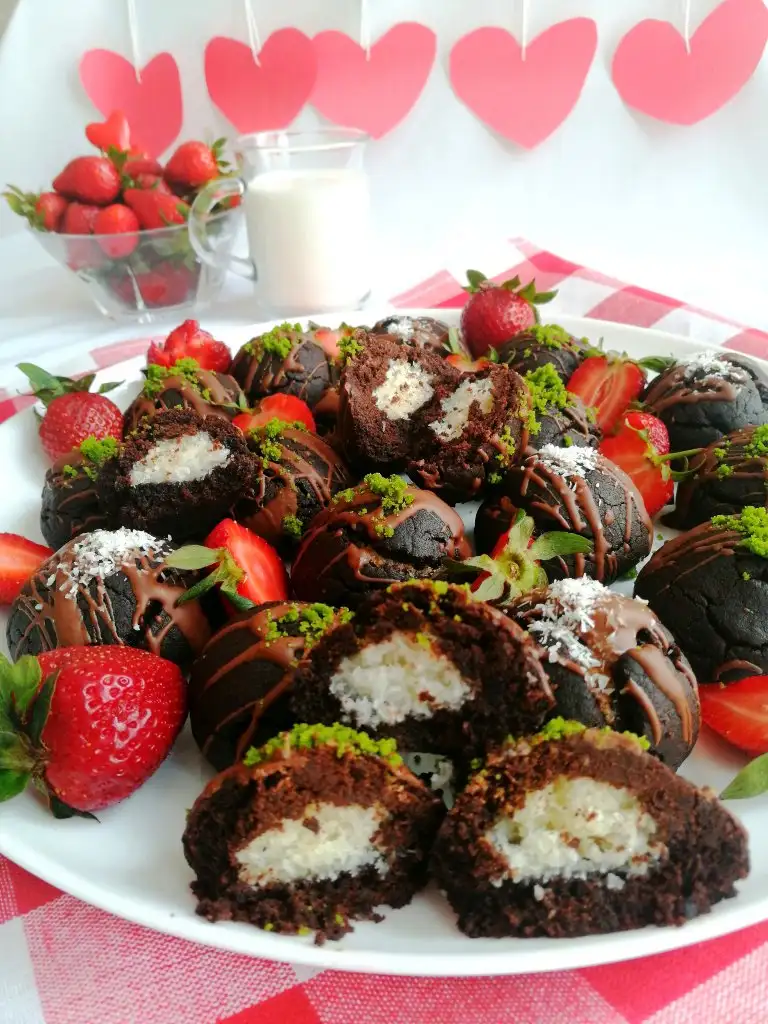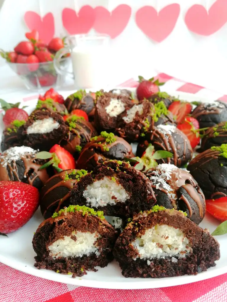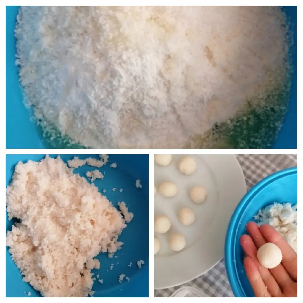 Hazırladığımız hindistan cevizi toplarından 1 tane alarak, uçlarını kapatıp çok bastırmadan yuvarlayalım.