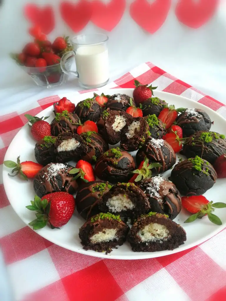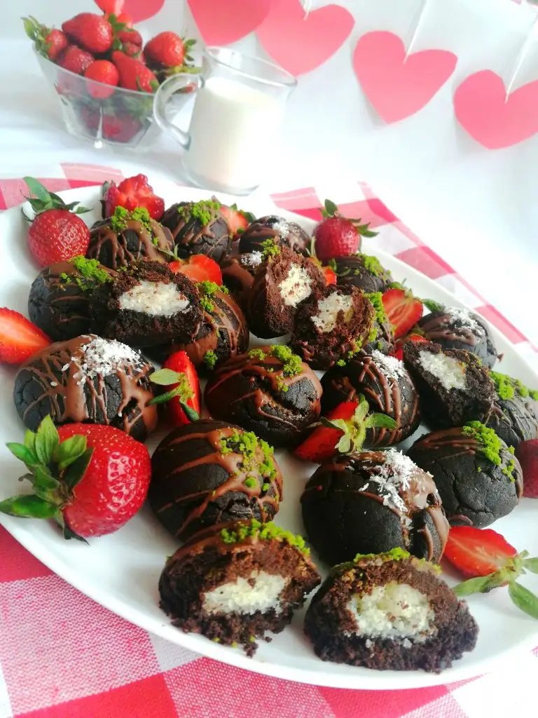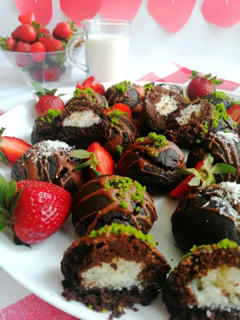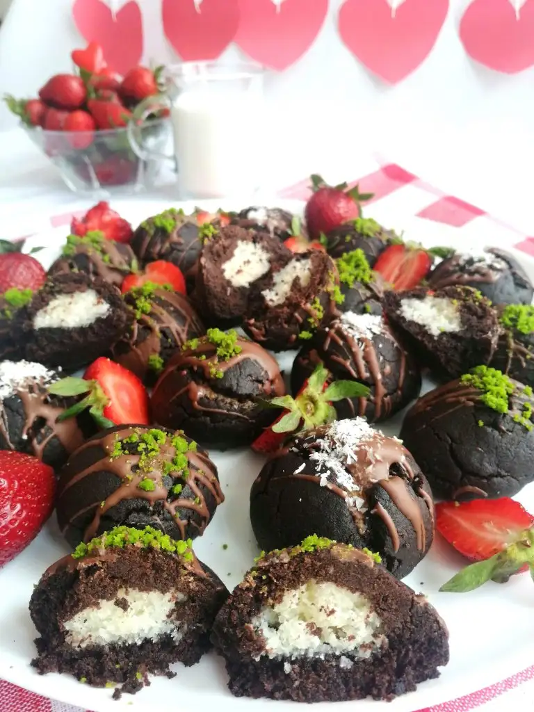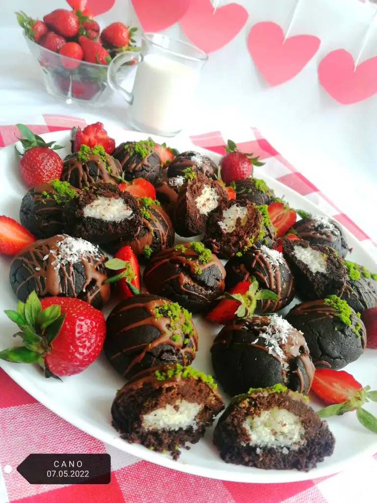 Hazırladığımız hindistan cevizi toplarından 1 tane alarak, uçlarını kapatıp çok bastırmadan yuvarlayalım.
