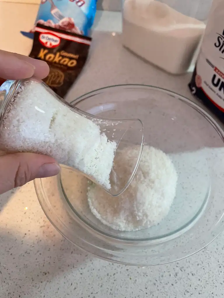 ardından hindistancevizi, yumurta akı ve pudra şekeriyle kurabiyemizin iç harcını hazırlayalım.