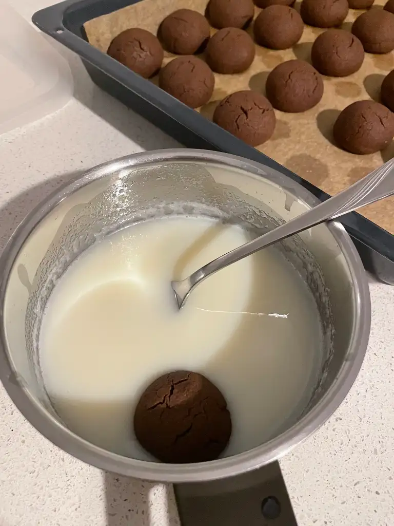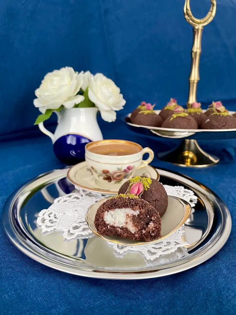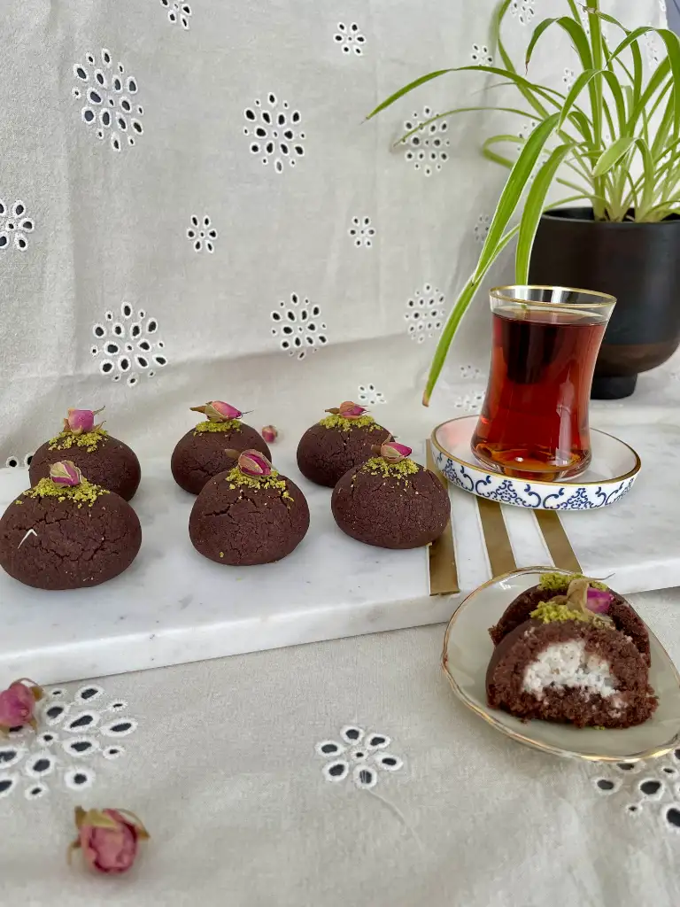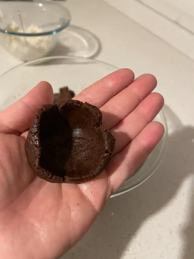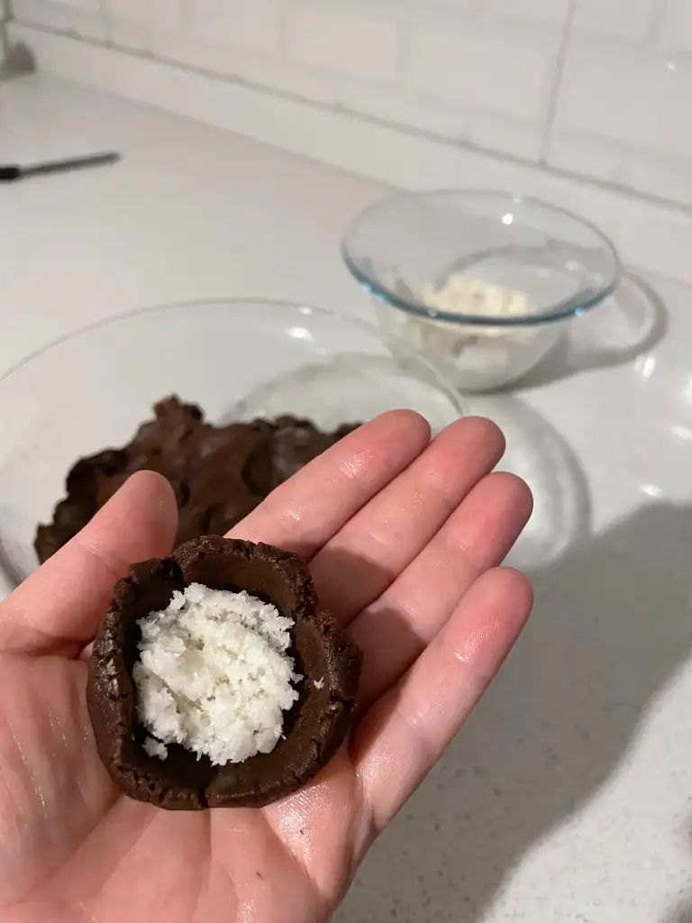 daha sonra kurabiye hamurundan ceviz büyüklüğünde parçalar koparıp içli köfte yapar gibi ortasını açıp içine hindistancevizli harçtan koyup kapatıyoruz.