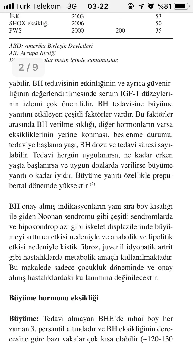 Bende simdi internette makaleyi bulup bastan sona okudum. Her tedavi yili icin +1 cm boy kazanci elde ediyormusuz. Oglum 9 yasinda ve dediklerine gore 1 yil icinde ergenlik baslayacakmis. Insallah gec kalmamisizdir. Acikcasi her gecen gun vakit kaybettigimizi hissediyorum. Bugun oglum tedavi ne zaman baslayacak diye sordu. Korktugunu anlayabiliyorum. Sabah aksam ayni seyi dusunuyorum. Allah yardimcimiz olsun.