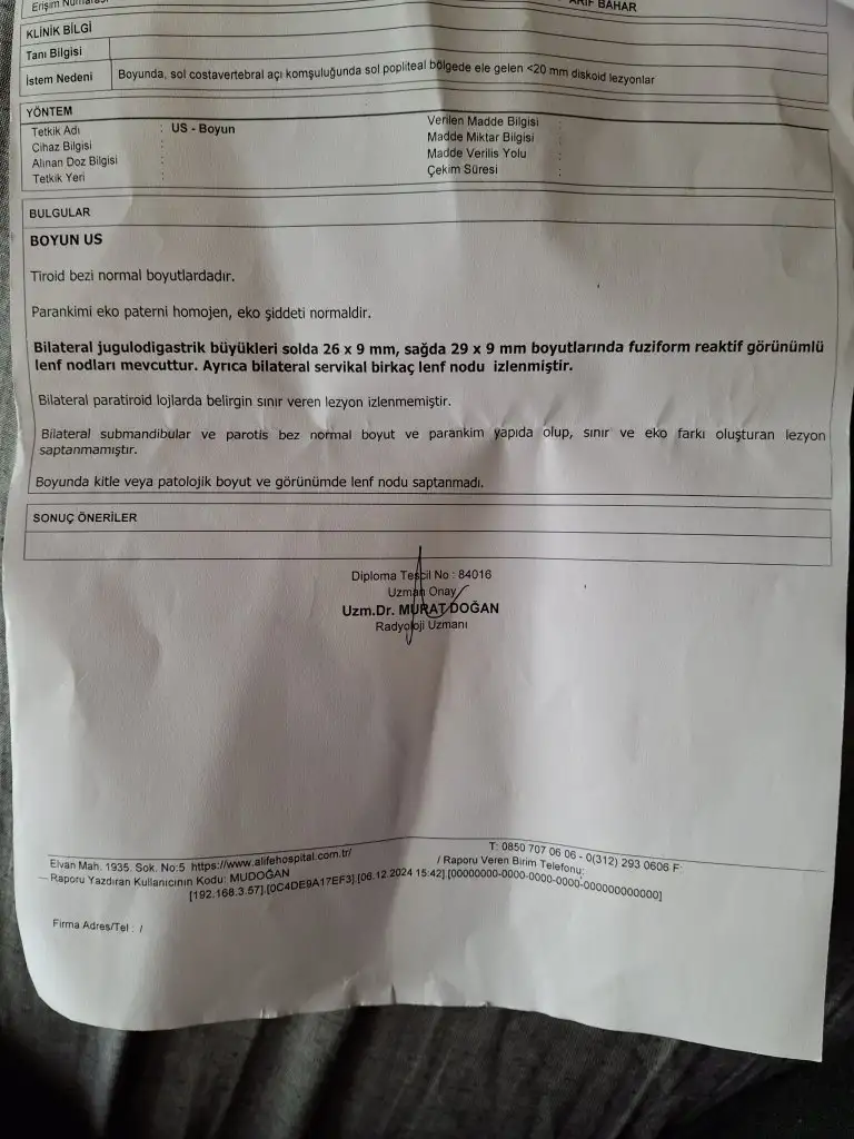Canım ilk doktor yağ bezesi dedi, başka özel hastaneye götürdük ankarada lenf dediler, solda 26×9mm,sağda 29×9mm reaktif görünümlü lenf nodları yazıyor