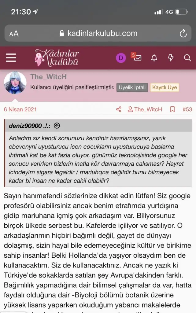 Nerede uyuşturucuyu normal karşıladığını yazmıs alıntılar mısınız ?Benim kendi doğrularımı ne yapacağımı size mi soracağım? Siz kimsiniz ? Otorite mi? Eğitim durumunuz nedir akıl verecek?? Siz bu kadının önceki konularını okumadığınız belli, mariuhana icin normal çevremdeki arkadaslarım da iciuor dedi? Yani bu kadın belki kendisi de iciyor esi ile ortaktı? Saglıklı bir kadın saglıklı bir anne esrarı normal karsılama !! Kaldı ki ben kendi doğrum ile cimer e bu yorumlasmaları gönderdim. Kk dan bunla alakalı bilgi talep edilir heralde sikayetimin konusu da uyusturucuyu normallestirme benim hayatımda asla normal olmayacak bir konu olduğundan ve kendimi bildiğimden üzdügüm yerden üzülmem siz rahat olun benim icin endiselendiğiniz icin müteşekkir kaldım size