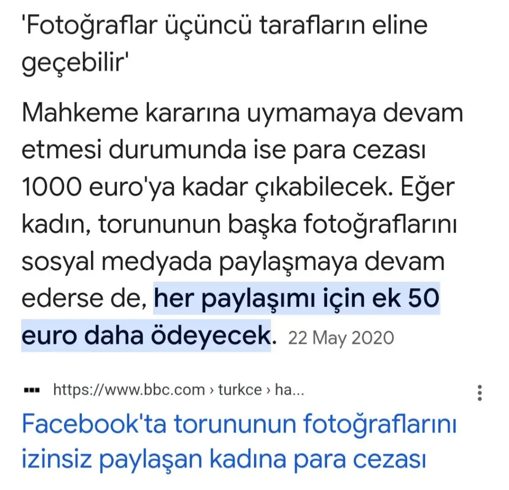 Hah ben de diyorum ki ‘rahatsızlığa bakmıyor’ bu durum.Ben kendi annem, babam ya da kayinpederim çocuğumun fotosunu paylassa rahatsiz olmam dedim. Onlar da birinci derece yakınım olduğu için. Herkes herkesin çocuğunu paylaşsın bu yasal demedim. Ne hakla soylediklerimi çarpıtıp yasa ihlalini normallestirme vs. gibi seyler yaptığımı söylersiniz??? Anne baba istemedigi sürece elbette çocuğun fotosu paylasilmamali. Zaten konu sahibine de soyledim, rahatsiz olduysaniz eşiniz aracılığıyla kayinpederinize rahatsız oldugunuzu iletin diye. Lütfen böyle genellemeler yapmayin rica ediyorum. istemeyen kimsenin çocuğunun fotosu zorla paylasilamaz. Bunu savunan kimse yok burda.