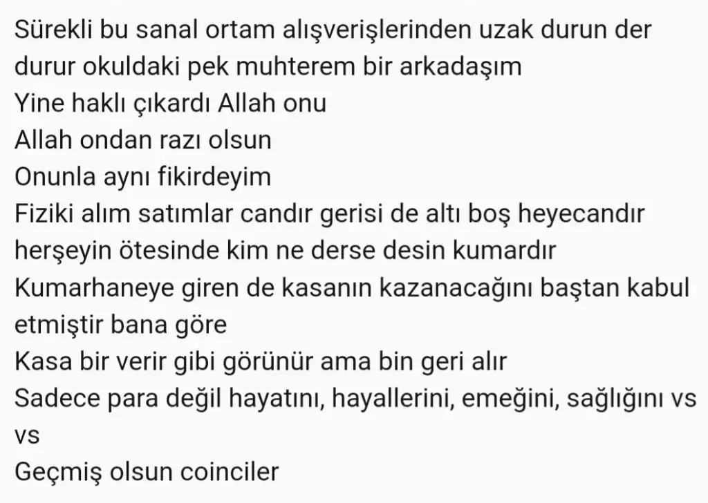 Benim yorumumu ne amaçla yazdığım konusunda istediğin gibi algılayabilir yorumlayabilirsinEn kötüsü de yasananlar ile ilgili hiç bir fikri olmayanların böyle yorum yapması. Ben bu yorumu geçmiş olsun dileğinden çok oh olsun yada bak ben demiştim olarak görüyorum. Ama biraz finans bilgisi olan büyük resmi gorebiliyor; sürekli para basıldığında neler olduğunu, bunlar olurken bile kaç kişinin bir kaç günde milyar dolarlar goturdugunu ve hayatının değiştiğini, tesadüf eseri bir sürü şey olup ucuz kurtulani, canı yanan insanların aslında neler hissettigini ve en kötüsü sürekli para basıldığında neler oldugunu yapılacak adimlar olmasına rağmen olmadığını. O yüzden tartışmaya gerek yok ne siz geçmiş olsun diyin ne coinciler kendini anlatsın. Zira ateş düşen evleri veya şansına kazananların cesaretle yarın neler yaşayacağını anlatamayız.
