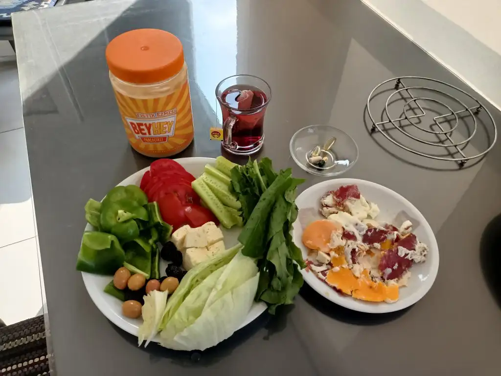 İki yumurtayla cemensiz pastırma+bol sebzeli tabagim...