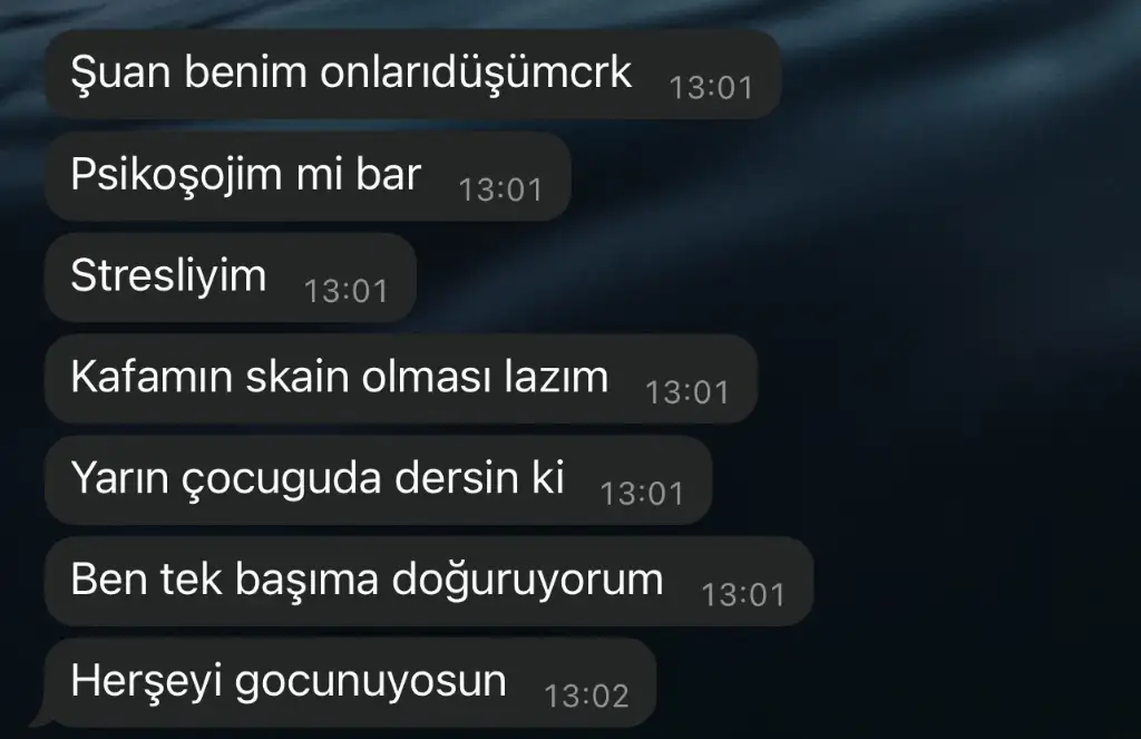 En son ben doktora gidiyorum işyerim kapanmak uzere işsiz kalma korkusu, borçlarım var bi yandan, bi yandan özel sigortam bitmeden hpv komtrollerimi yaptırayım derdindeyim , oda mali musavirlik sınavına hazırlanıyor sureklı sınavım var benı strese sokma, sınavım bitsin hsl caresine bakarız ama sıfır dert ediyor. Hpv hala atamamısım kolposkopi olmam gerek onun stresını yaşıyorum doktora benle gel dedim diye, neymiş onun sınavı varmış o yokken napıyormusum ondan önce nasılmhallediyormusum böyle seyleri, cocugun sınsvı var diyip kendim halledemiyormusum bes dk doktora goruncekmısım. Böyle dedi ve bende ayrıldım artık ama kızlar kendıme saygımı yiiyirmisim. Hala benı sucladı. Sureklı kavga cıkarmısım. Engrlledim her yerden. Bana smsten onu bu zor dönemınde yalnız bıraktıgın ıcın benı affetmicekmiiş bilmem ne yszmıs. Normaldende engelledim. Ama o kadar kızgın ve kırgınımko. Asıl ciddi şeylerle uğraşan ben kavgacı gozuken ben duzelmesı gereken benmısım bana psikolog önericekmiş. Yani bu erkekler hep mi böyle. Ben de artık hayatımı iyi yönde değiştriip benim hayatımı kolaylastırıcak birini istiyorum ya dur ben hallederim diyen birini, hallederiz diyen ibirini. Ben artık cok yoruldum. Neden sevilmek ıcın kendımı bu kadar düşürüyorum bilmiyorum ama gerçekten cok yorukdum. 27 yasındayım herşeyi tek basıma hallediyorum güçlüym evet yaparım ama neden baskaları gibi bizede prenses gibi davranmıyorlar. Gerçekten cok uzgunum.. dertlesmek ıstedım