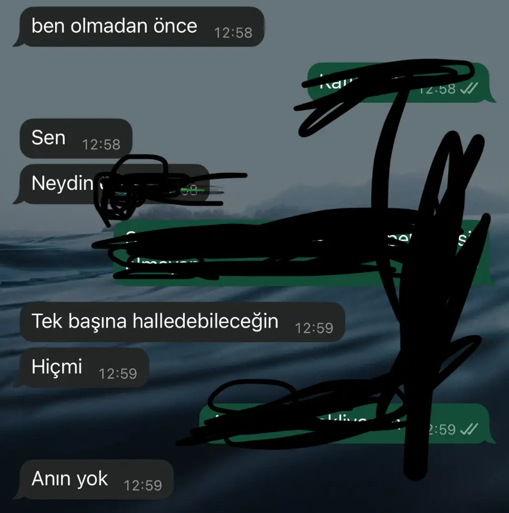 Ben artık sinirden küfür edicek kadar kriz geçirrm ağlarım sonra bak sen saygısızsın kğfrediyosun der yüzüöe telefonu kapatır yine ben suclu olurum