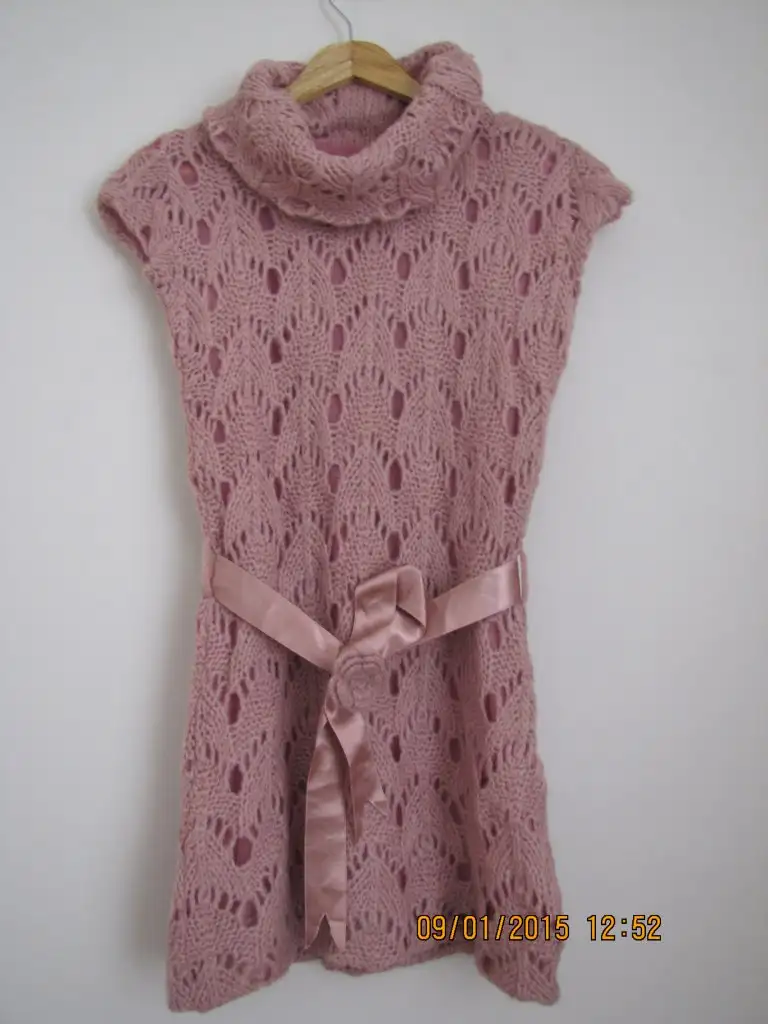 Degaje yaka tunik veya mini elbise.İçi astarlı dışı gül kurusu dantel örgü hazır.Beli kuşaklı veya kuşaksız da kullanılabilen hiç giyilmemiş M beden.Düşük kol.25 lira