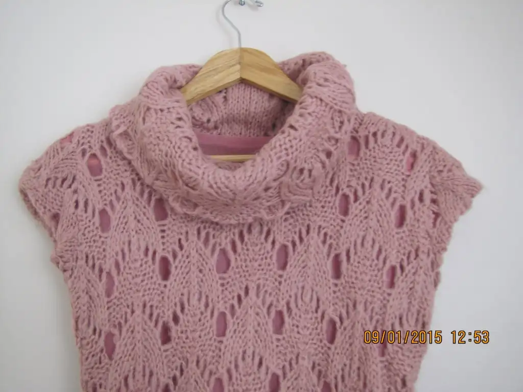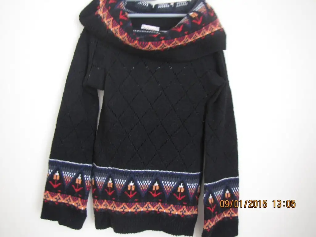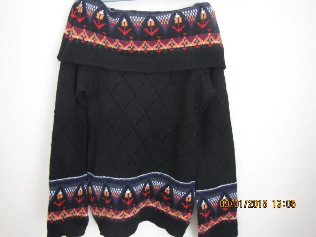 Siyah delikli model degaje yaka veya omuzlara indirilerek kullanılabilen modelli kazak.motif desenli.15 lira.M beden bel kısmı oturur şekilde dar.