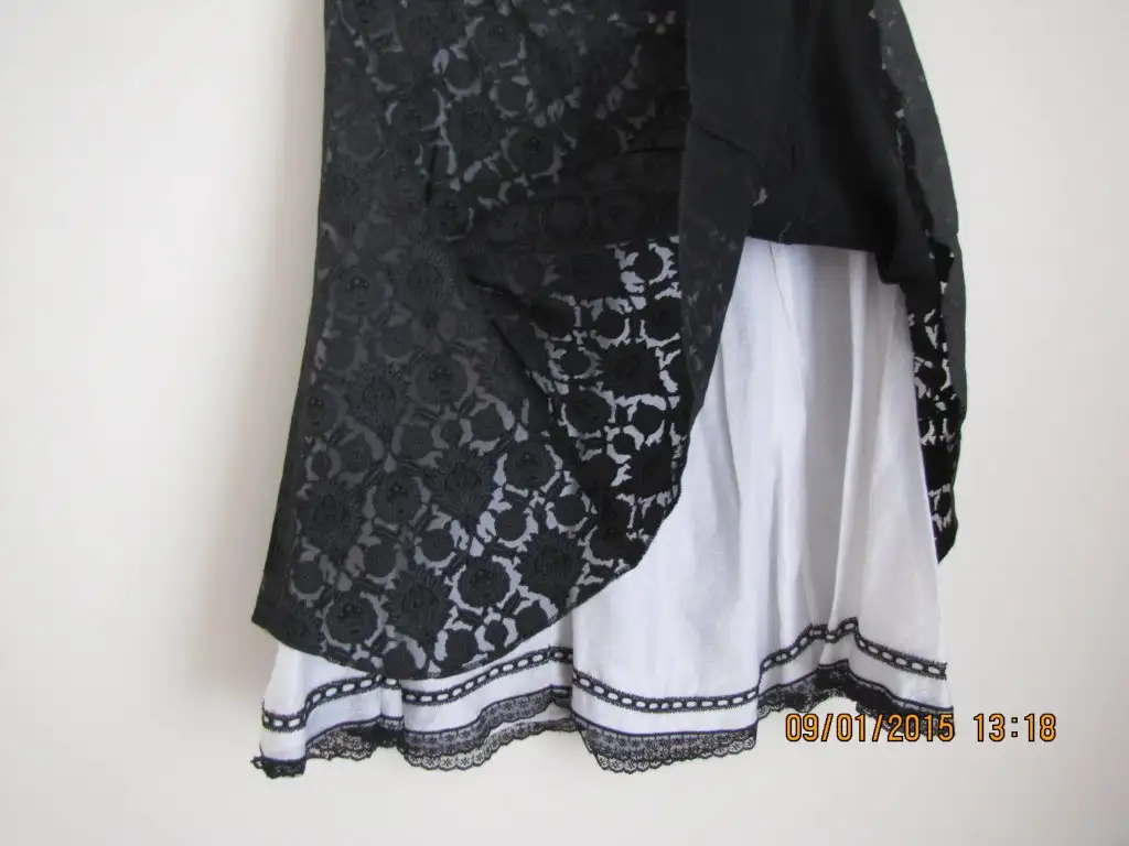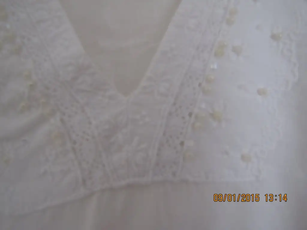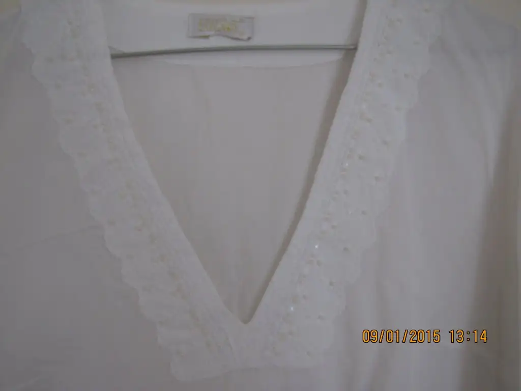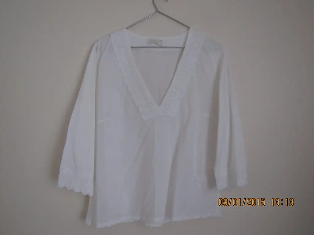 Beyaz ince M beden dekolte yaka kolları ve yaka boncuk dantel işlemeli. Birkaç kez giyilmiş ilandaki Çiçekli eteğin üzerine alınmış bluz.10 lira
