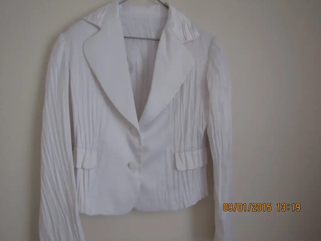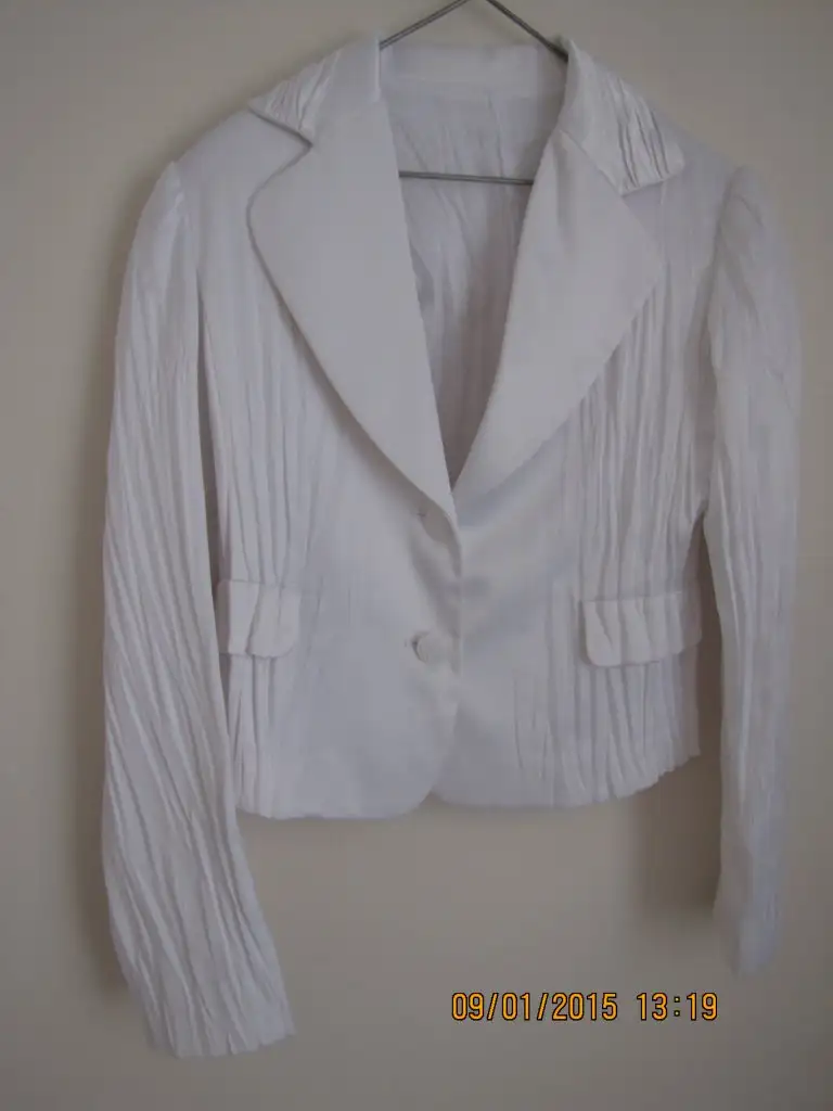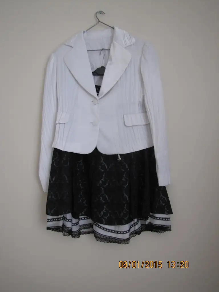 Takım beyaz ceket siyah etek. Nişan merasimi için alınmış olup 1 kez evde giyilmiştir.40 beden.Ceket saten kırışık model cekettir. Etek de siyah beyaz şeklinde.İhtiyaçtan satıyorum 80 lira takımı