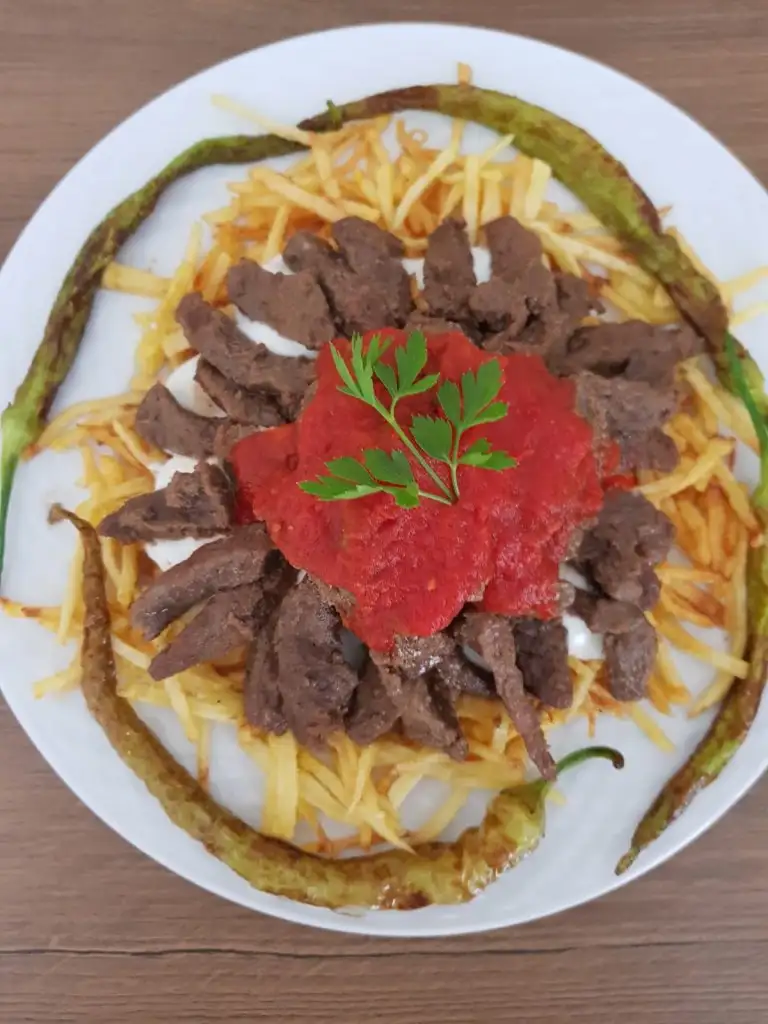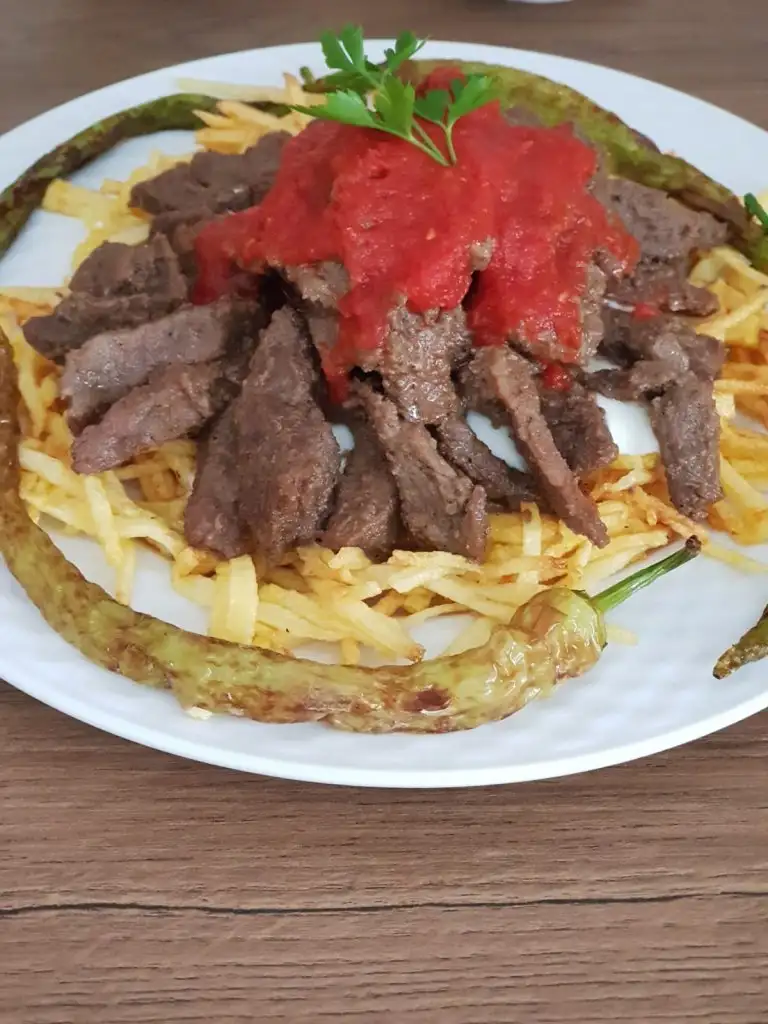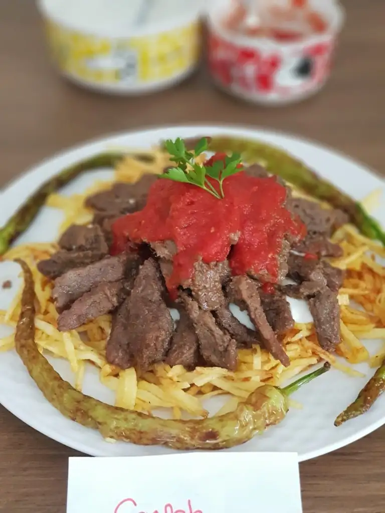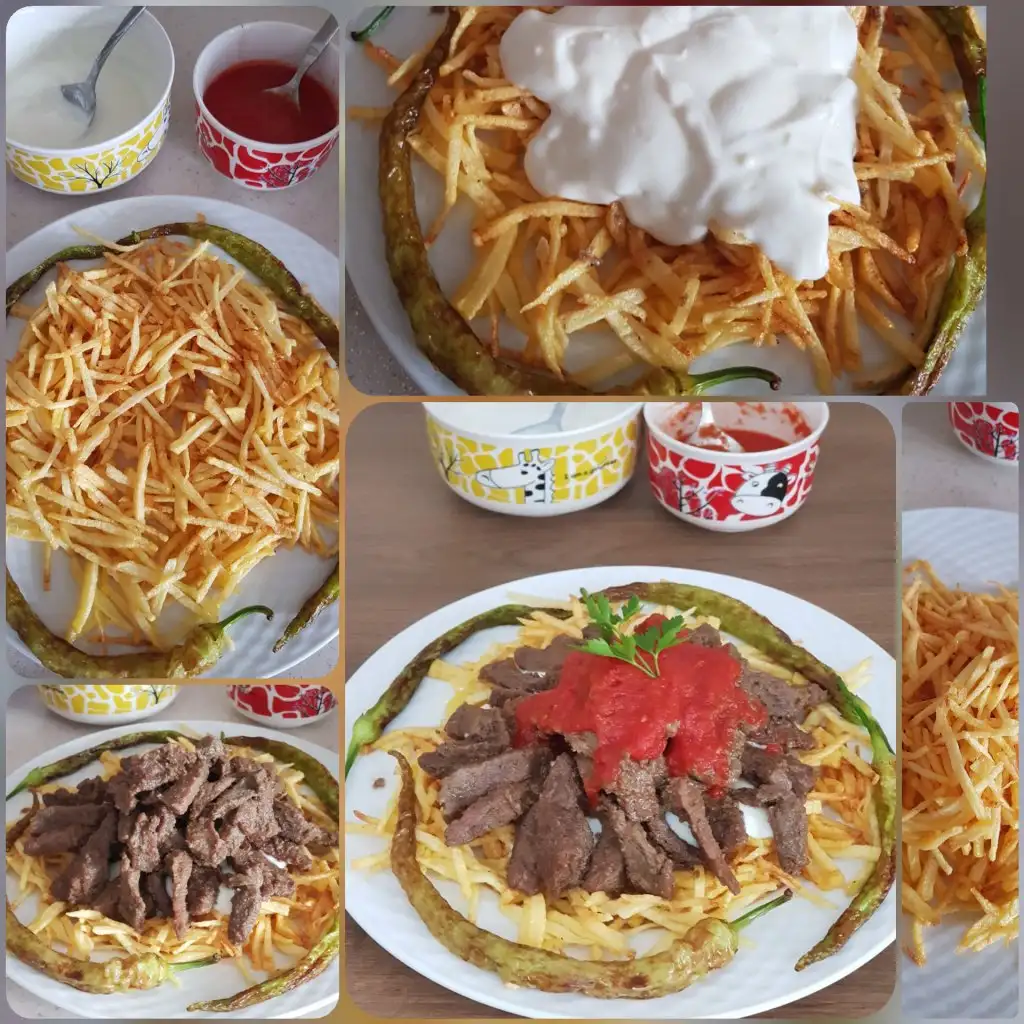Tavayi iyice kizdirip Marine olan etimizi kızgın tavada muhurluyoruz ve 1 çay bardağı sıcak su ekleyip etimizi soteliyoruz.Bu sırada sarımsaklı yogurdumuzu hazırlıyoruz.Domates sosunu kışlık hazırladığım konserveden kullandim domates rendeleyip yağda kizdirabilirsiniz ya da Salça. Etimizin pismesine yakın patateslerimizi kizartmaya baslayabiliriz tavaya azar azar atıp kizartiyoruz ki birbirine yapismasinlar.Evet kibrit patates et yoğurt ve sos hepsi hazır şimdi birlestirelim.tabagimiza çıtır patatealerimizi döküp üzerine 4 5 kaşık sarımsaklı yoğurt gezdiriyoruz onun üzerine etlerimizi ve son olarak domates sosunu döküp servise hazır ediyoruz.Bu birleşimin tadını çıkarıyoruz