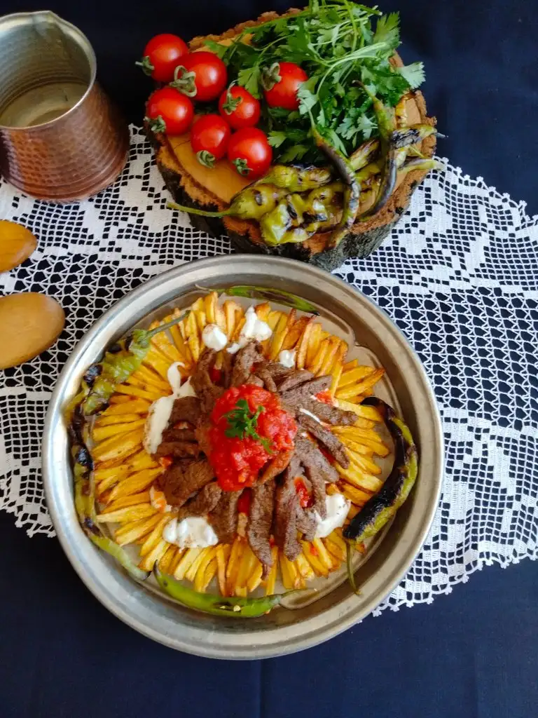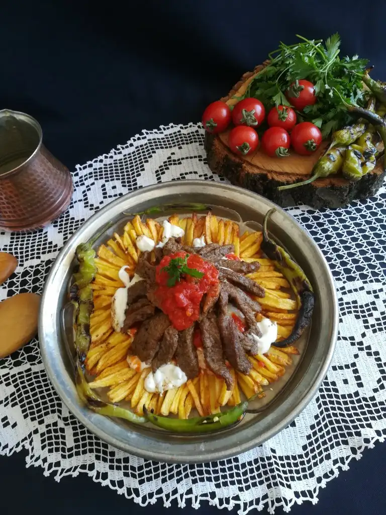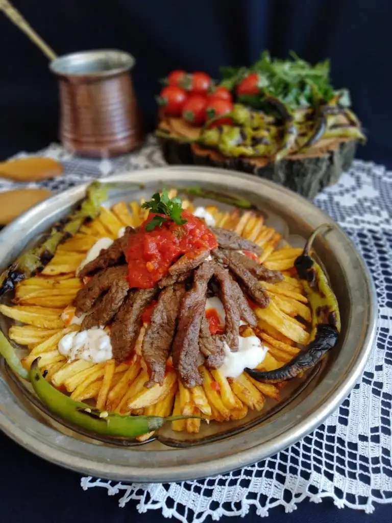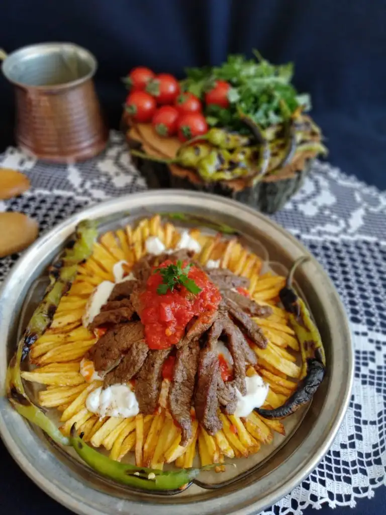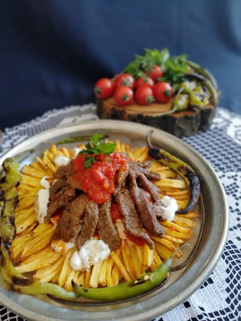 Servis tabağına patates, yoğurt ve eti sırayla yerleştiriyoruz.