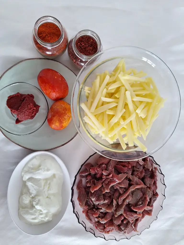Servis tabağına önce patatesleri sonra yoğurt, et ve sosumuzu döküp servise hazırlıyoruz