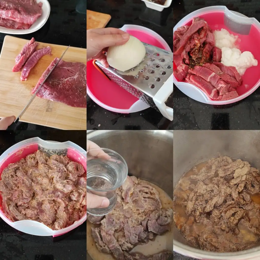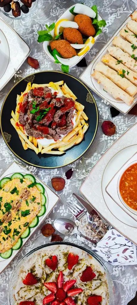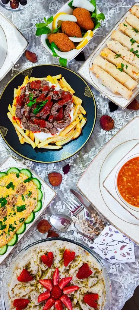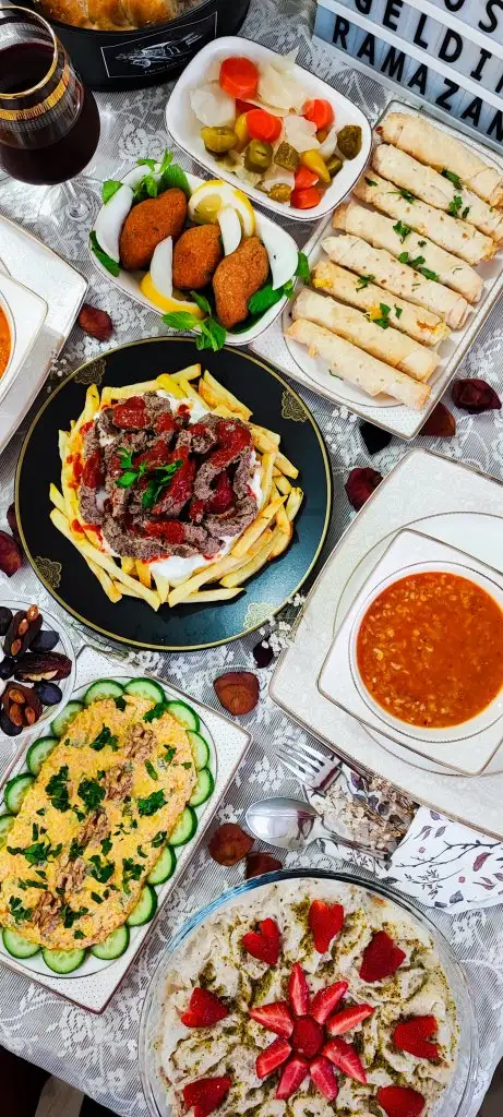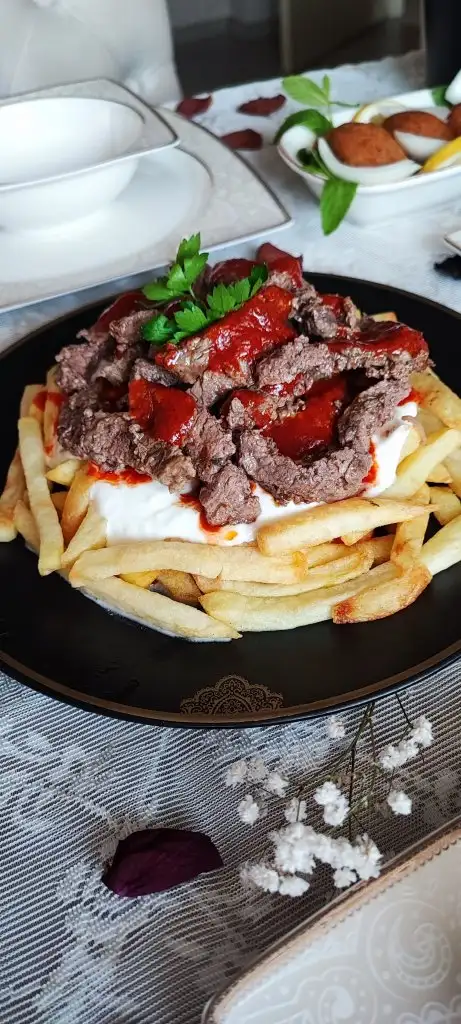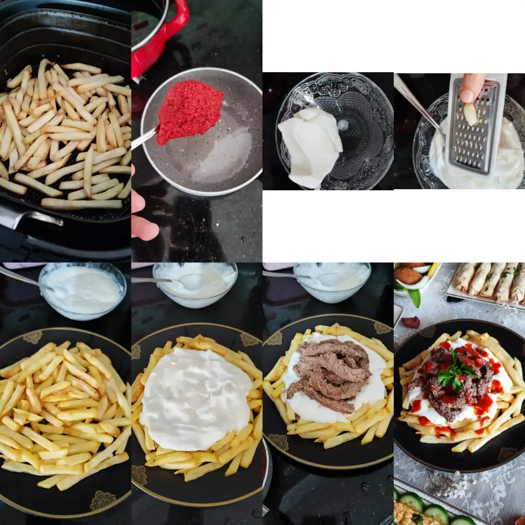 Önce eti marine edip dolaba kaldırıyoruz ardından çıkarıp üzerine biraz su ekleyerek 10 dk düdüklüde pişiriyoruz(dileyen tencerede 30-40 dk arası kontrollü pişirebilir). Etler pişince patatesleri kızartıp, yoğurdu ve sosu hazırlayalım. Ardından sırayla fotodaki gibi tabağımızı oluşturalım işte bu kadar