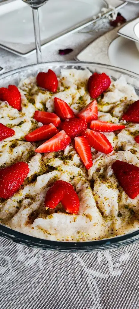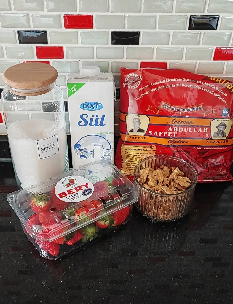 - Üzerini süslemek için toz Antep fıstığı ve çilek