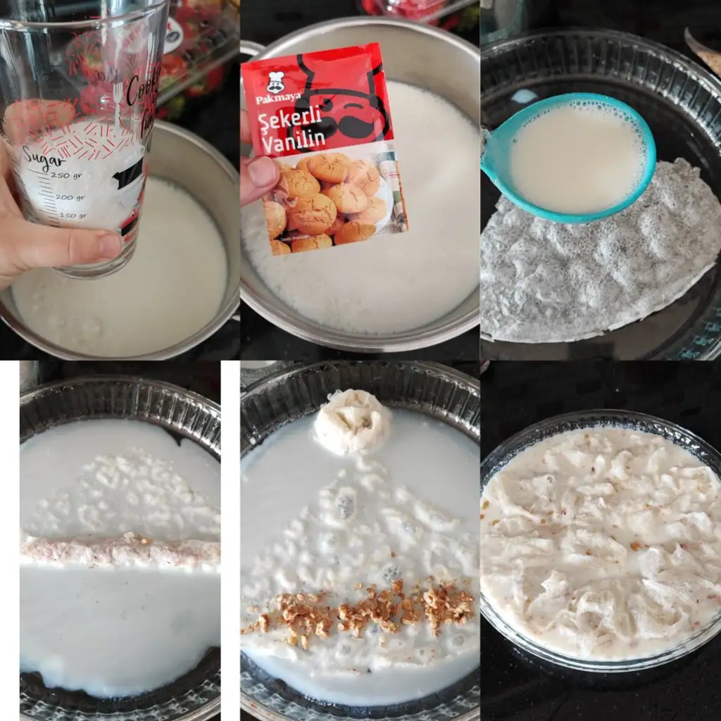 Süt şeker ve vanilyalı ısıtıyoruz kaynatmadan, ılımaya yakın yaprakları ıslıyor ve ceviz koyarak gül böreği yapar gibi sarıyoruz kalan sütü de üzerine döküp dolaba kaldırıyoruz servis ederken süslüyoruz.