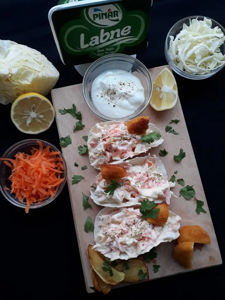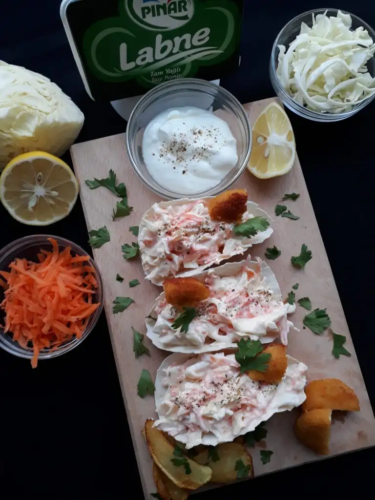 şeker, tuz,limon suyu ve sirkeyi karıştırıp şekerin erimesini sağlıyoruz. Sarımsağı rendeliyoruz. Labneyi, mayonezi, yoğurdu ekliyoruz. Sosumuzu hazırlıyoruz. Salata ve sosumuzu birleştiriyoruz.