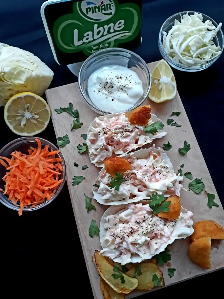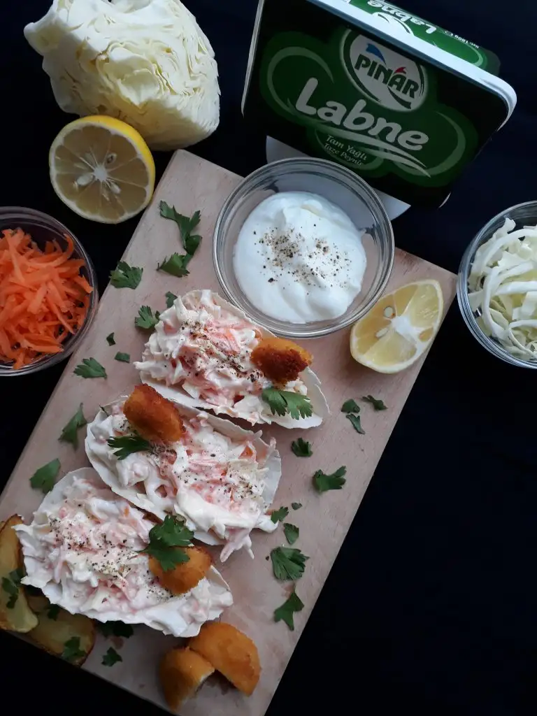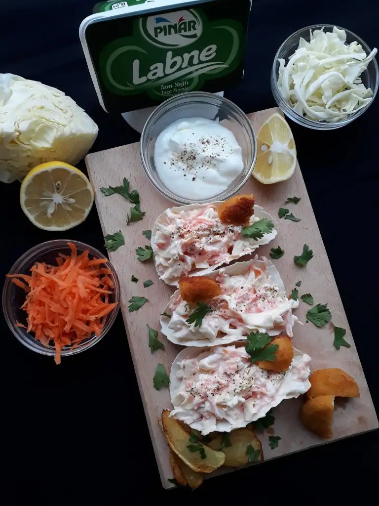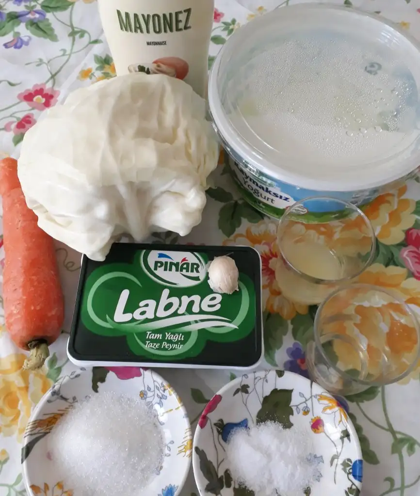 şeker, tuz,limon suyu ve sirkeyi karıştırıp şekerin erimesini sağlıyoruz. Sarımsağı rendeliyoruz. Labneyi, mayonezi, yoğurdu ekliyoruz. Sosumuzu hazırlıyoruz. Salata ve sosumuzu birleştiriyoruz.