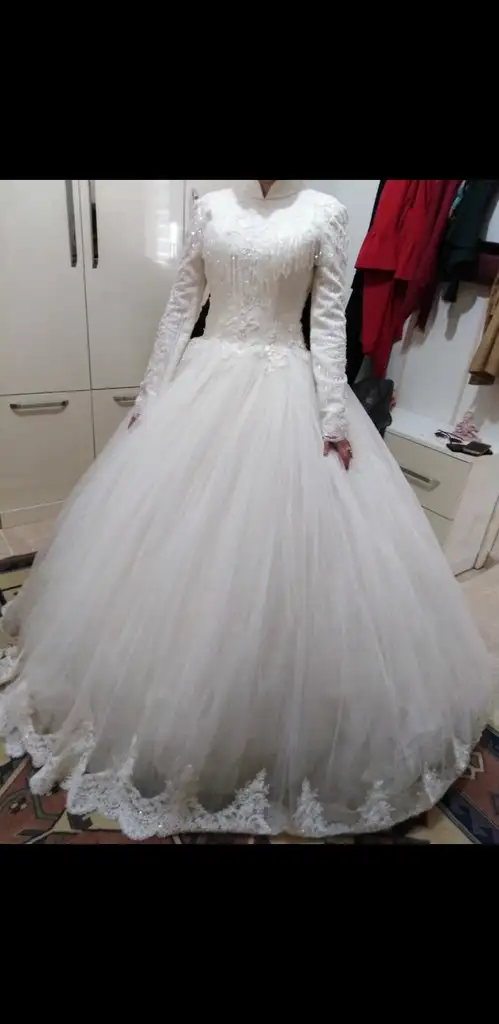 Merhaba hanımlar 36-38 beden uyumlu ozel dikim yeni sezon gelinliğimi eylül ayında 1 kez giydim herhangi bi yırtık sökük vs yok. Aslında tertemiz duruyor ama yinede kuru temizlemeye verilebilir. 2300 tlye diktirmistim 700 tlye satılıktır esarbı bonesiyle bırlıkte. Anlaşırsak pazarlık payida vardır:)