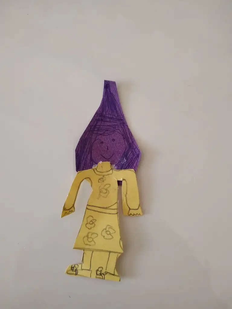Şaka yapmıyorum kendisi çizdi, çizerken yanında değildim hatta ama dün kağıt bebeklerle oynayıp kaldırdık, onlardan birine benzetmeye çalışmıs, bakarak çizmedi ama ayrıntılara dikkat etmiş, belindeki kemer, kolyesi, ayakkabısındaki çiçek hepsine dikkat etmiş oynarken.