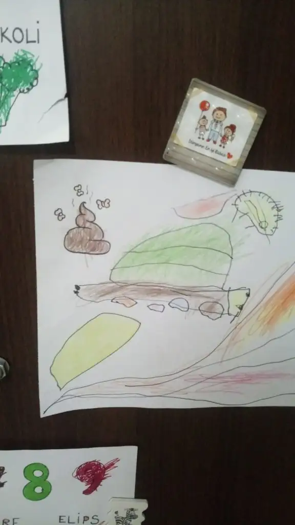 O çizdiğini de önce kaplumbağa sandım, sonra anlatıyor "Bu koooccaman bir karpuz ve tır onu taşıyor"
