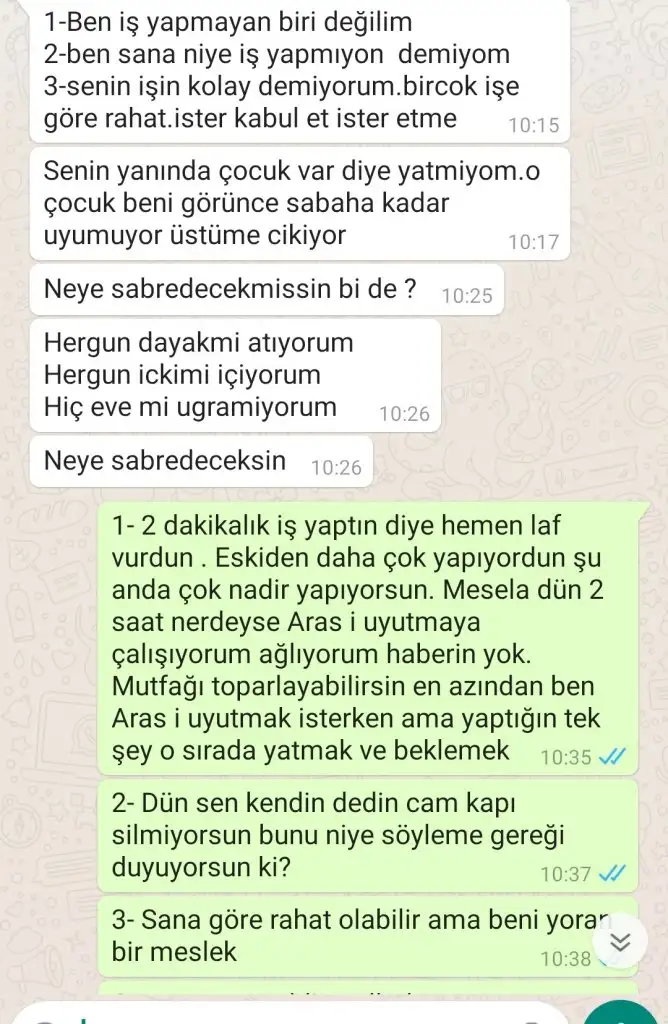 Ben o 3 yazdığı şeye cevap dahi yazmadım. Çünkü bunu daha önce de konuştuk bunlardan biri olsa ben zaten boşanırım demiştim. Bunu kendi de biliyor. Ama o kadar destek olmuyor ki övünerek diyebildiği şeyler sadece bunlar kaldı.