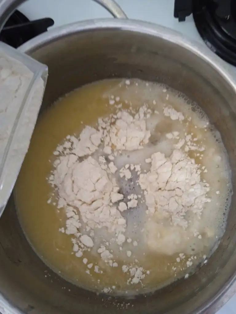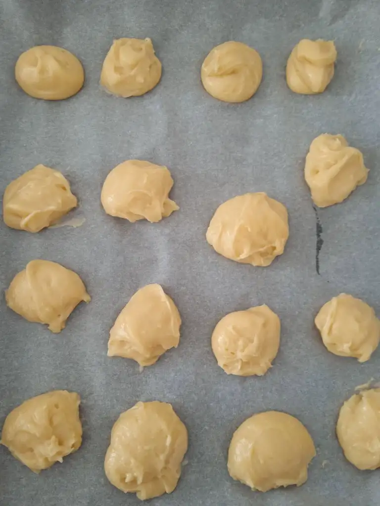 Şimdi gelelim choux hamuruna tavaya su, tereyağ , karbonat ve tuzu ekleyin, yağ eriyene kadar kısık ateşte karıştırın.Ardından unu ilave edin iyice toparlanıp hamur kıvamına geldikten sonra ocaktan alın ve soğumaya bırakın.Sonra tek tek yumurtaları kırıp güzelce çırpın. Her eklediğiniz yumurtayı çok iyi çırpmalısınız püf noktası bu, ardından hamuru sıkma torbasına koyun ve yağlı kağıt serilmiş fırın tepsisine aralıklı olucak şekilde sıkın.Sıkma torbamın kalmadığını bu aşamada farkettim ben kaşıkla devam ettim