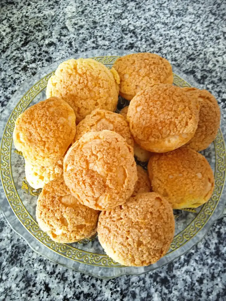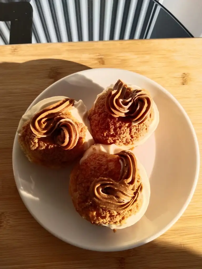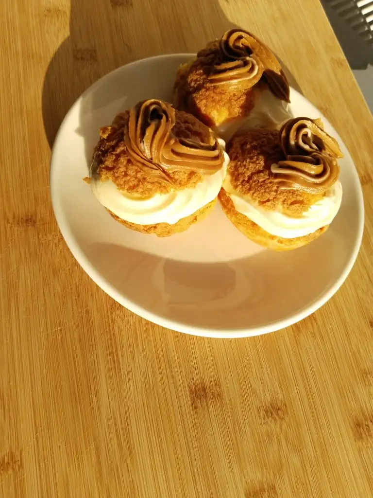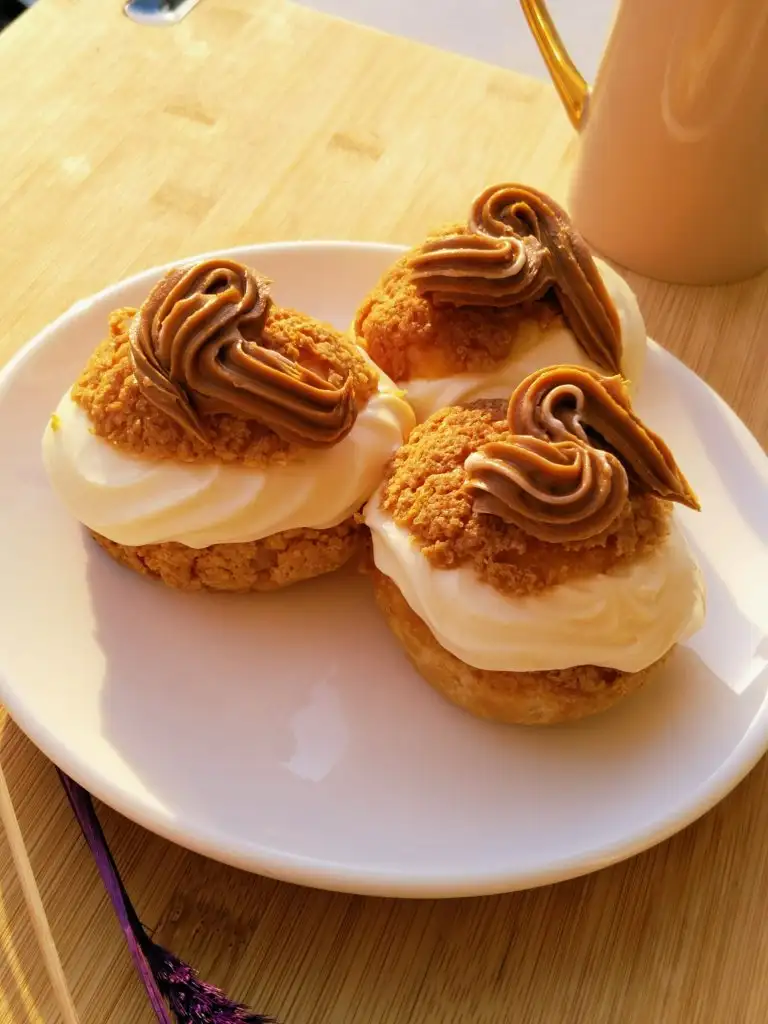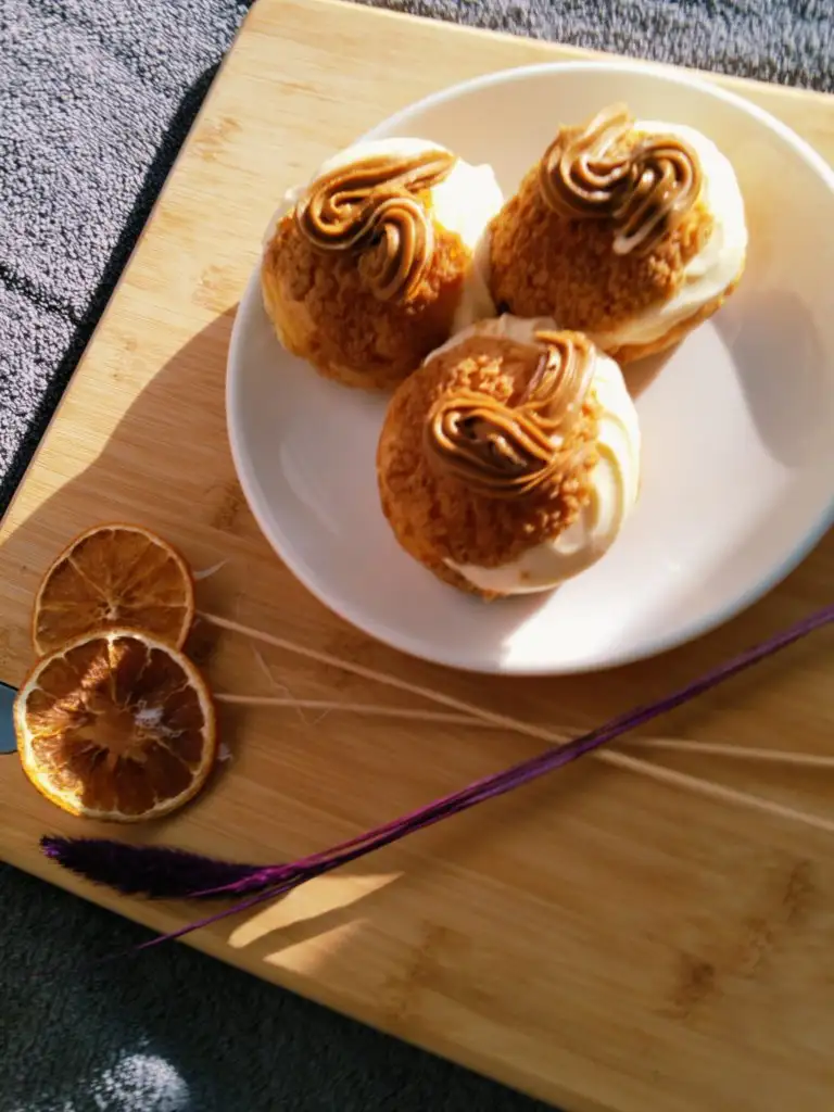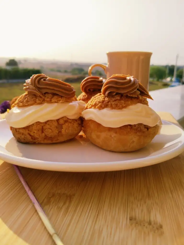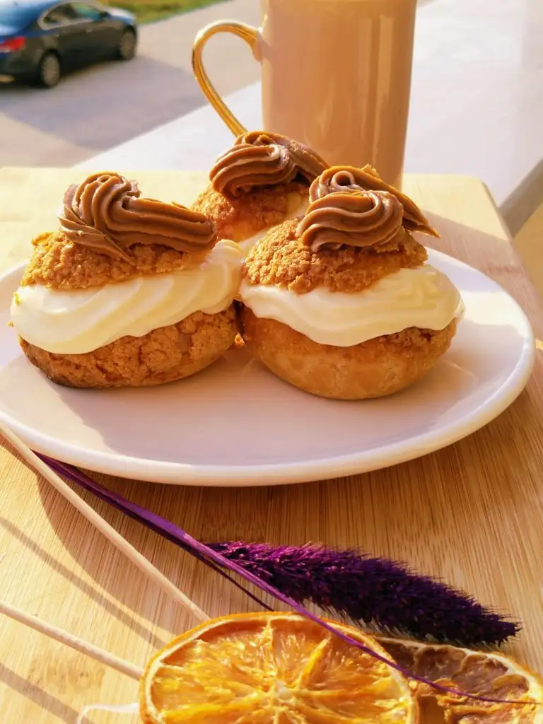 Kurabiye hamuru için tüm malzemeleri bir kaba ekleyip yoğurun,Esmer şeker kullanmadığım için biraz zerdeçal ekleyip hamurun sararttim.İki yağlı kağıt arasına alıp merdane ile ince olucak şekilde açın.Ardından buzluğa koyup 15 dakika donmasını bekleyin.Sonrasında buzluktan çıkarıp çay bardağı ile şekil verip choux hamurunun üzerlerine sırasıyla koyun.En az yarım saat önceden ısıttığınız 160° fırına verip iyice kabarıp kızarana kadar pişirin. Kontrollü pişirin, kapağını pişene kadar kesinlikle açmayın söner ,piştikten sonra fırından çıkarın ve tamamen soğuyana kadar dokunmayın iyice soğusun sertleşsin