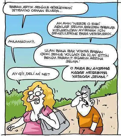 neyse faceden birbirimizi ekledik o eskişehirdeydi ben konyada aban eskişehire gel tanışalım dedi ben de dedim kli ben gelemem tanışmak istiyorsan sen gel konyaya neyse geldi tanıştık.ilk görüşmemiz bir pastanede oldu (ilk ve son görüşmemişdi zaten).birer dilim pasta ve meyvesuyu geldi.konuşmaya başladı hep kendinden bahsediyor.sonra bana telefonund<an arabasını gösteriyor şevrolet marka arabası varmış , saatini gösteriyor teksastan gelmiş.bana soruyor nasıl beni beğendin mi? ben çok mu zayıfım? felan filan ben o zman anladım olmayacağını neyse ordan kalktık çay içmeye gittik çay içtik.orda konuştuk yine biraz.ben boşandığımı söyledim şok oldu.ama düşünelim dedi tamam dedim sen de düşün ben de düşüneyim dedim öylece gittik evlerimize.sonra ben buna yüz vermedim aramadım sormadım bu arada bir mesaj yazıyordu en son yaz tatilinde bana mesaj yazdı.nasılsın felan diye ben de dedim ki bak bizimki olmayacak umarım karşına iyi biri çıkar mutlu olursun dedim.hemen faceden tamam anlamına gelen el işaretini yaptık.O ZMAN SENİN İÇİN HARCADIĞIM PARALARI GERİ İSTİYORUM dedi.ne dedim şaka yapıyorsun herhalde dedim.yok dedi.