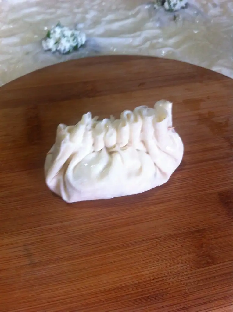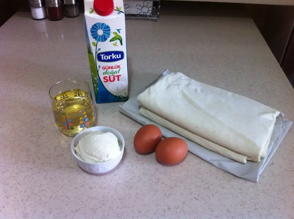 4. yufkayıda aynı şekilde serip aynı soslama işlemini yapıyoruz ve aynı yere bu seferde peynirli içten yaymadan 1 kş. koyuruz .