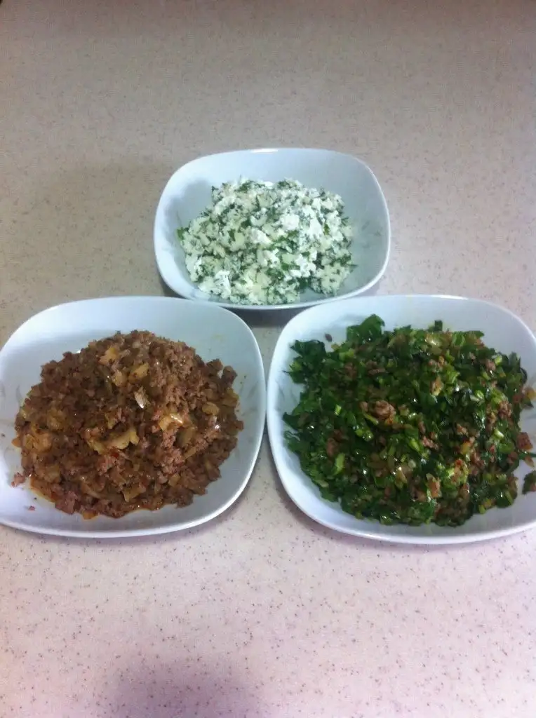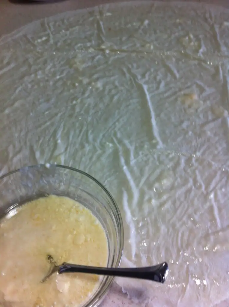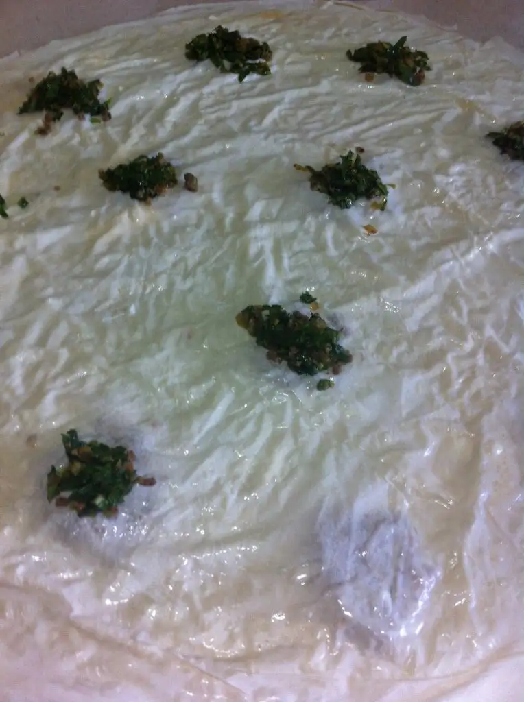 3. yufkayıda aynı şekilde seriyoruz ve aynı sosla yağlama işlemini yapıyoruz .ve bu seferde 1 kş. ıspanaklı içten ekliyoruz ..