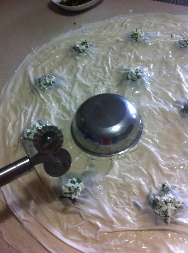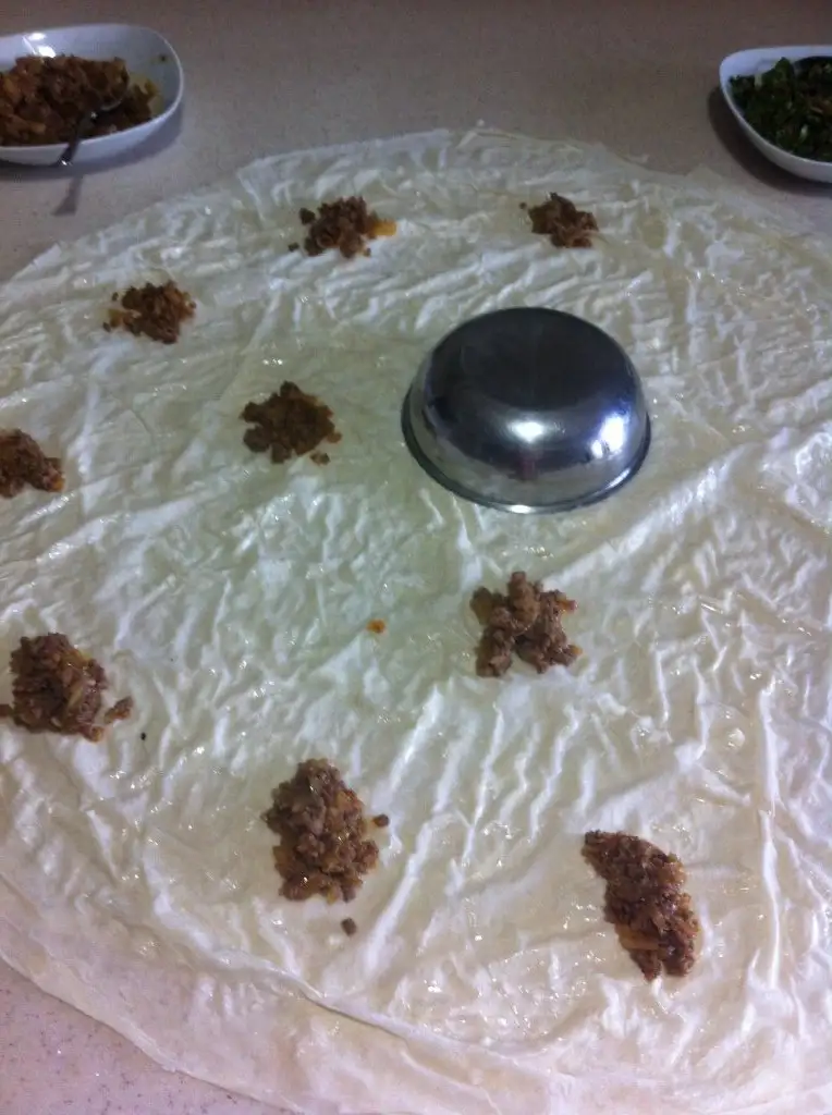 burdan sonra belli bir daire şeklinde kesecegimiz için ya göz kararı yada benim kulandığım gibi bir kapla belirleyip ilk harcımız kıymalı içten 1 kaşık ekliyoruz . yaymanıza gerek yok ne kadar toplu olursa börek içinde o kadar iyi olur ..